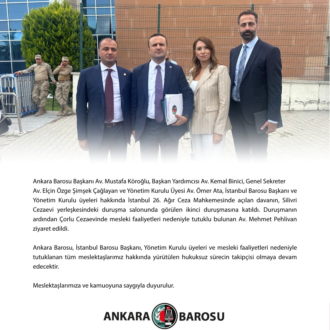 Ankara Barosu Başkanı Av. Mustafa Köroğlu, Başkan Yardımcısı Av. Kemal Binici, Genel Sekreter Av. Elçin Özge Şimşek Çağlayan ve Yönetim Kurulu Üyesi Av. Ömer Ata, İstanbul Barosu Başkanı ve Yönetim Kurulu üyeleri hakkında İstanbul 26. Ağır Ceza Mahkemesinde açılan davanın, Silivri Cezaevi yerleşkesindeki duruşma salonunda görülen ikinci duruşmasına katıldı. Duruşmanın ardından Çorlu Cezaevinde mesleki faaliyetleri nedeniyle tutuklu bulunan Av. Mehmet Pehlivan ziyaret edildi.