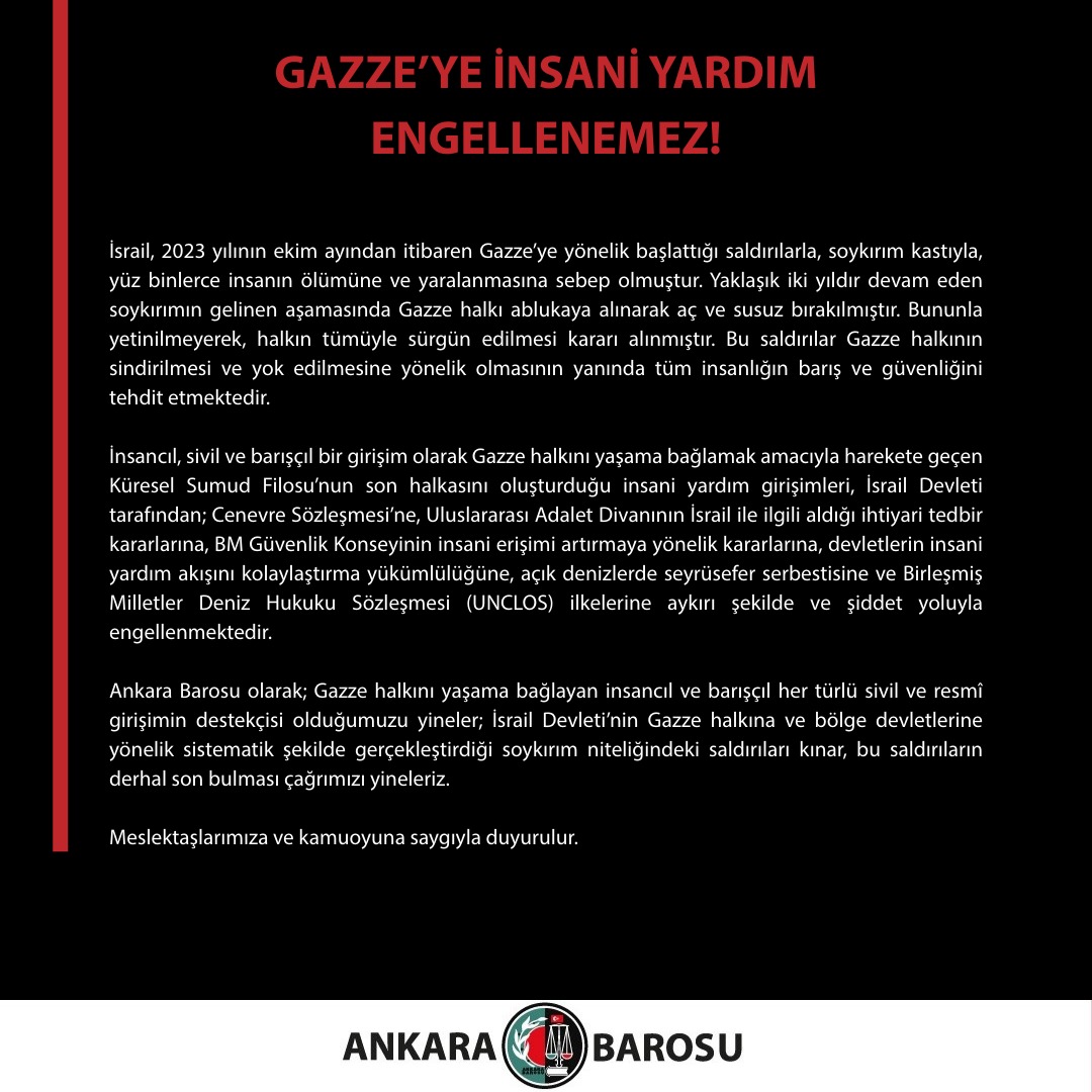 Ankara Barosu olarak; Gazze halkını yaşama bağlayan insancıl ve barışçıl her türlü sivil ve resmî girişimin destekçisi olduğumuzu yineler; İsrail Devleti’nin Gazze halkına ve bölge devletlerine yönelik sistematik şekilde gerçekleştirdiği soykırım niteliğindeki saldırıları kınar, bu saldırıların derhal son bulması çağrımızı yineleriz.