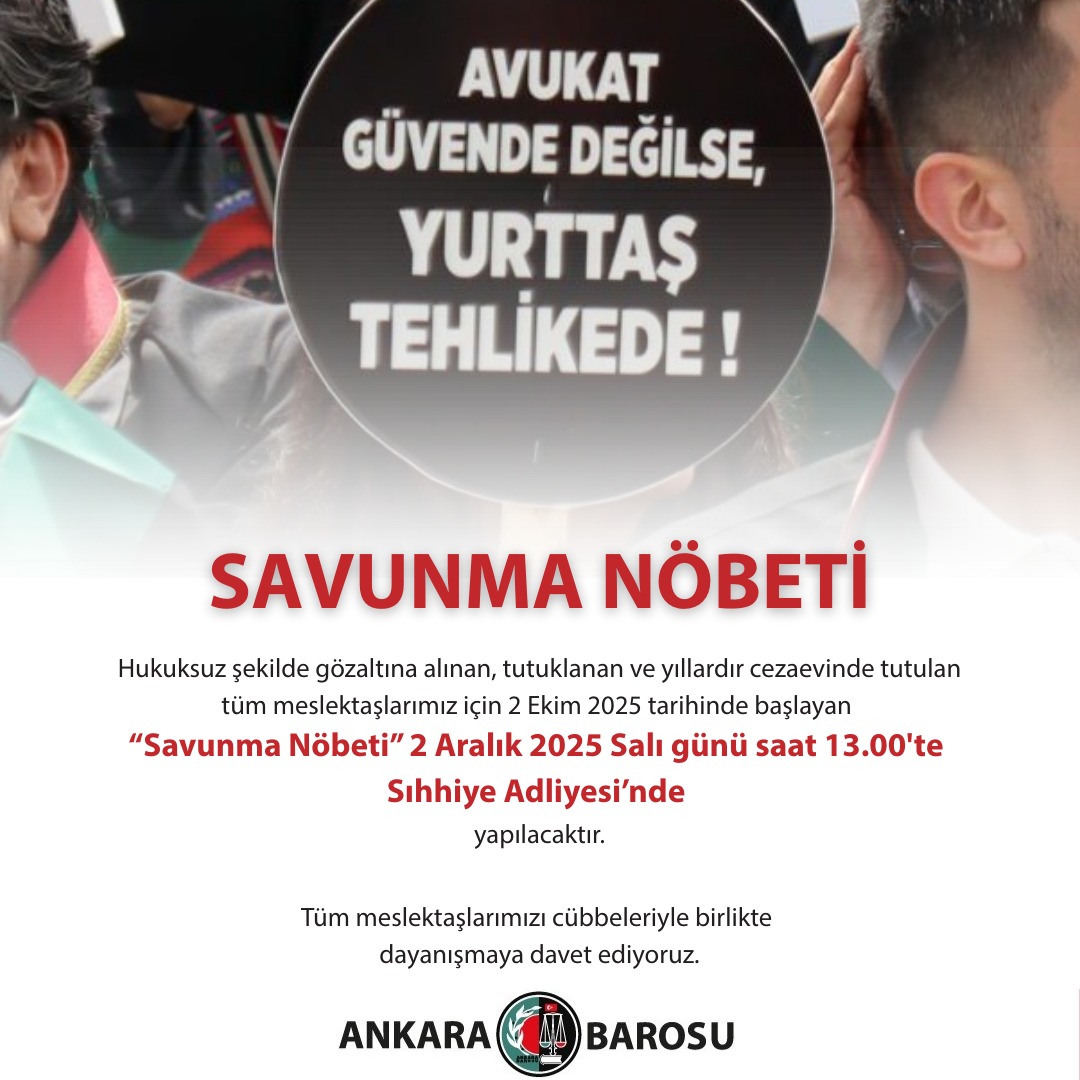 HUKUKSUZ ŞEKİLDE GÖZALTINA ALINAN, TUTUKLANAN VE YILLARDIR CEZAEVİNDE TUTULAN TÜM MESLEKTAŞLARIMIZ İÇİN 2 EKİM 2025 TARİHİNDE BAŞLAYAN “SAVUNMA NÖBETİ” 2 ARALIK 2025 SALI GÜNÜ SAAT 13.00'TE SIHHİYE ADLİYESİ’NDE YAPILACAKTIR