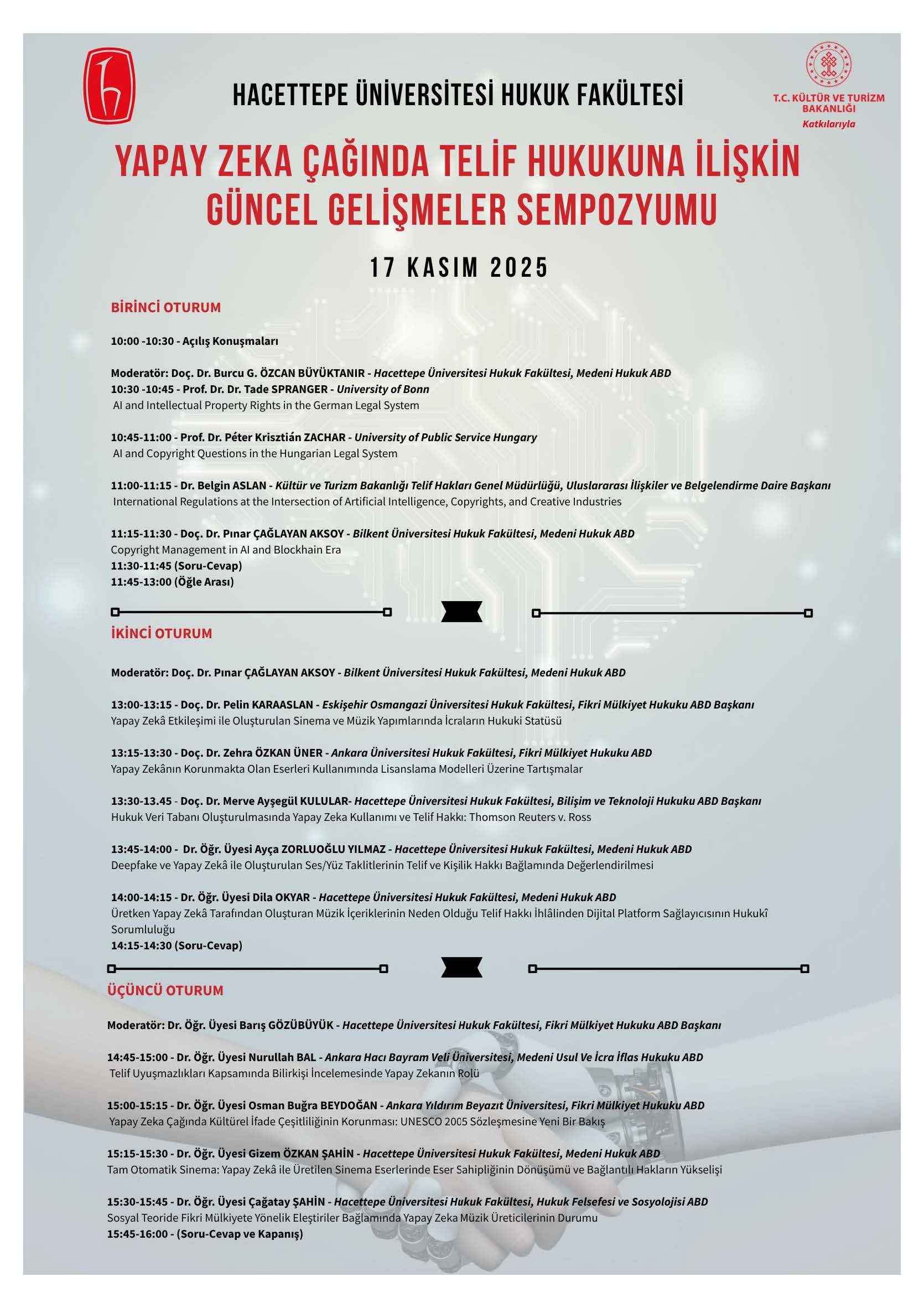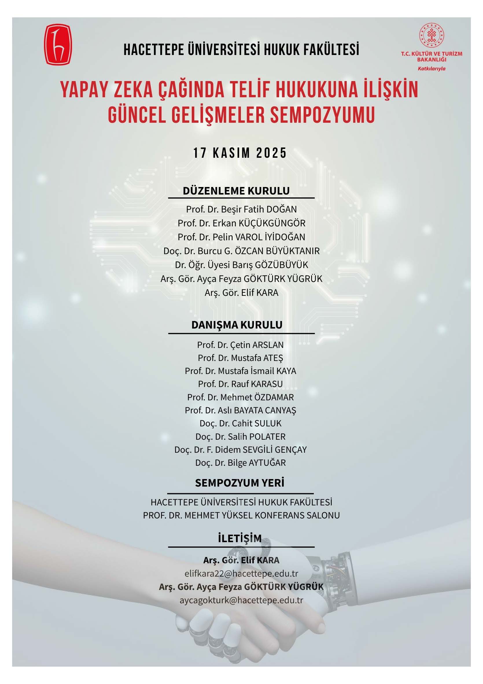 Hacettepe Üniversitesi Hukuk Fakültesi Medeni Hukuk Ana Bilim Dalı ile Fikri Mülkiyet Hukuku Ana Bilim Dalı tarafından 17 Kasım 2025 tarihinde Hukuk Fakültesinde gerçekleştirilecek olan “Yapay Zekâ Çağında Telif Hukukuna İlişkin Güncel Gelişmeler Sempozyumu”