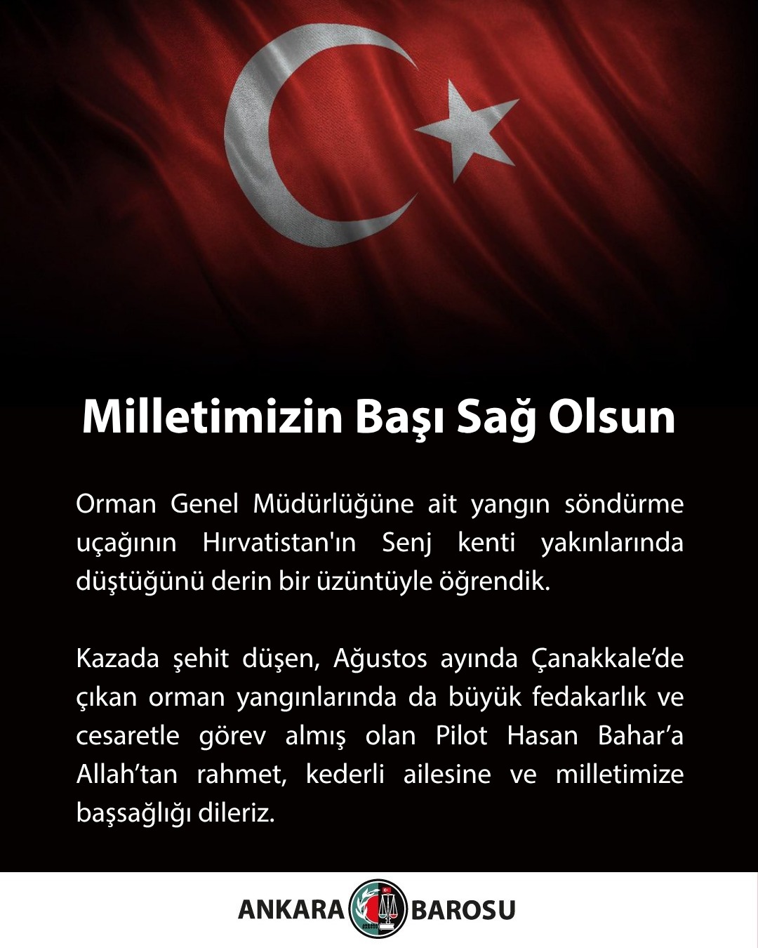 Orman Genel Müdürlüğüne ait yangın söndürme uçağının Hırvatistan'ın Senj kenti yakınlarında düştüğünü derin bir üzüntüyle öğrendik. Kazada şehit düşen, Ağustos ayında Çanakkale’de çıkan orman yangınlarında da büyük fedakarlık ve cesaretle görev almış olan Pilot Hasan Bahar’a Allah’tan rahmet, kederli ailesine ve milletimize başsağlığı dileriz.