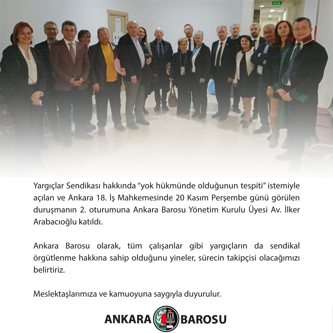 Ankara Barosu olarak, tüm çalışanlar gibi yargıçların da sendikal örgütlenme hakkına sahip olduğunu yineler, sürecin takipçisi olacağımızı belirtiriz.