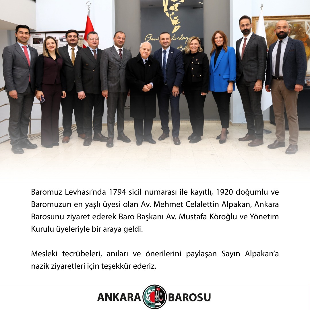 BAROMUZ LEVHASI’NDA 1794 SİCİL NUMARASI İLE KAYITLI, 1920 DOĞUMLU VE BAROMUZUN EN YAŞLI ÜYESİ OLAN AV. MEHMET CELALETTİN ALPAKAN, ANKARA BAROSUNU ZİYARET EDEREK BARO BAŞKANI AV. MUSTAFA KÖROĞLU VE YÖNETİM KURULU ÜYELERİYLE BİR ARAYA GELDİ.