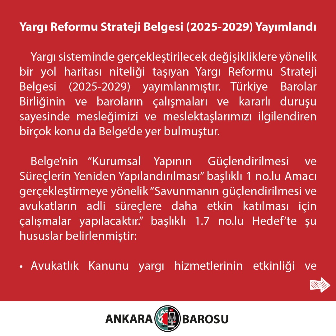 Yargı sisteminde gerçekleştirilecek değişikliklere yönelik bir yol haritası niteliği taşıyan Yargı Reformu Strateji Belgesi (2025-2029) yayımlanmıştır. Türkiye Barolar Birliğinin ve baroların çalışmaları ve kararlı duruşu sayesinde mesleğimizi ve meslektaşlarımızı ilgilendiren birçok konu da Belge’de yer bulmuştur.