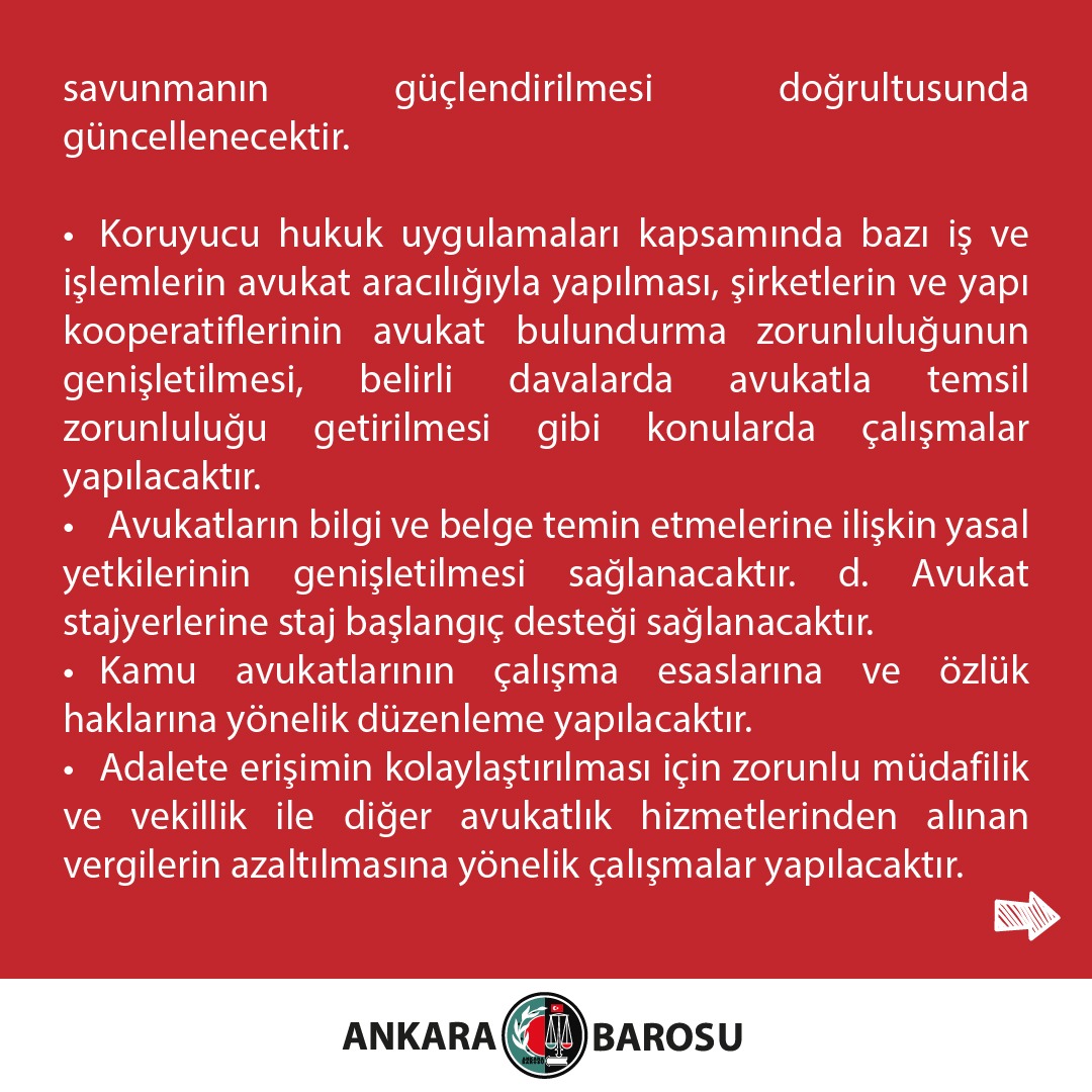 - Koruyucu hukuk uygulamaları kapsamında bazı iş ve işlemlerin avukat aracılığıyla yapılması, şirketlerin ve yapı kooperatiflerinin avukat bulundurma zorunluluğunun genişletilmesi, belirli davalarda avukatla temsil zorunluluğu getirilmesi gibi konularda çalışmalar yapılacaktır.