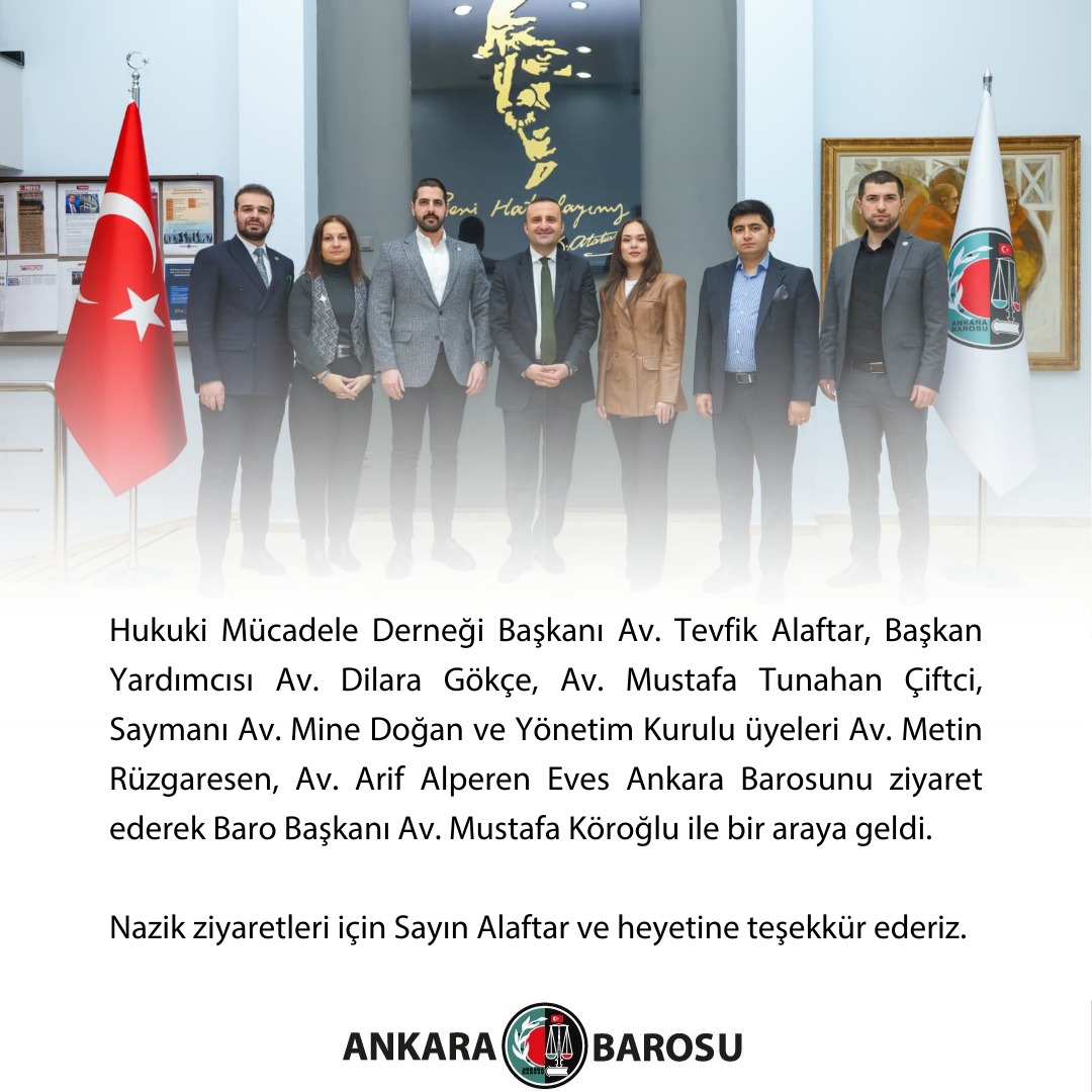 HUKUKİ MÜCADELE DERNEĞİ BAŞKANI AV. TEVFİK ALAFTAR, BAŞKAN YARDIMCISI AV. DİLARA GÖKÇE, AV. MUSTAFA TUNAHAN ÇİFTCİ, SAYMANI AV. MİNE DOĞAN VE YÖNETİM KURULU ÜYELERİ AV. METİN RÜZGARESEN, AV. ARİF ALPEREN EVES ANKARA BAROSUNU ZİYARET EDEREK BARO BAŞKANI AV. MUSTAFA KÖROĞLU İLE BİR ARAYA GELDİ.