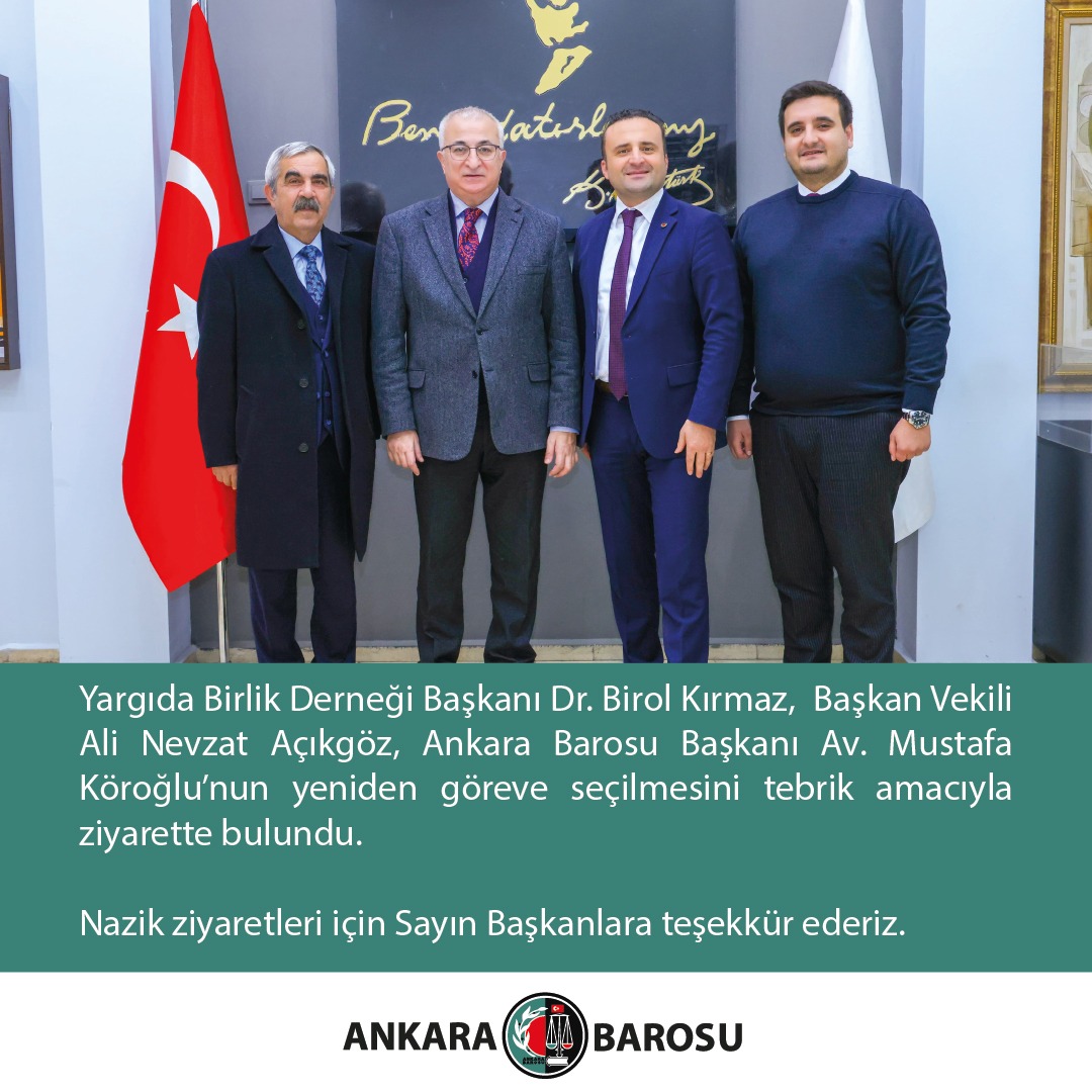 Yargıda Birlik Derneği Başkanı Dr. Birol Kırmaz, Başkan Vekili Ali Nevzat Açıkgöz, Ankara Barosu Başkanı Av. Mustafa Köroğlu’nun yeniden göreve seçilmesini tebrik amacıyla ziyarette bulundu.