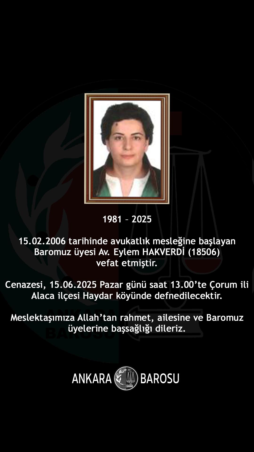 BAROMUZ ÜYESİ AV. EYLEM HAKVERDİ (18506) VEFAT ETMİŞTİR.
