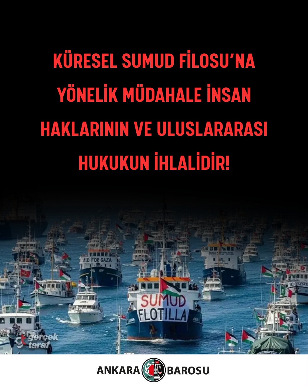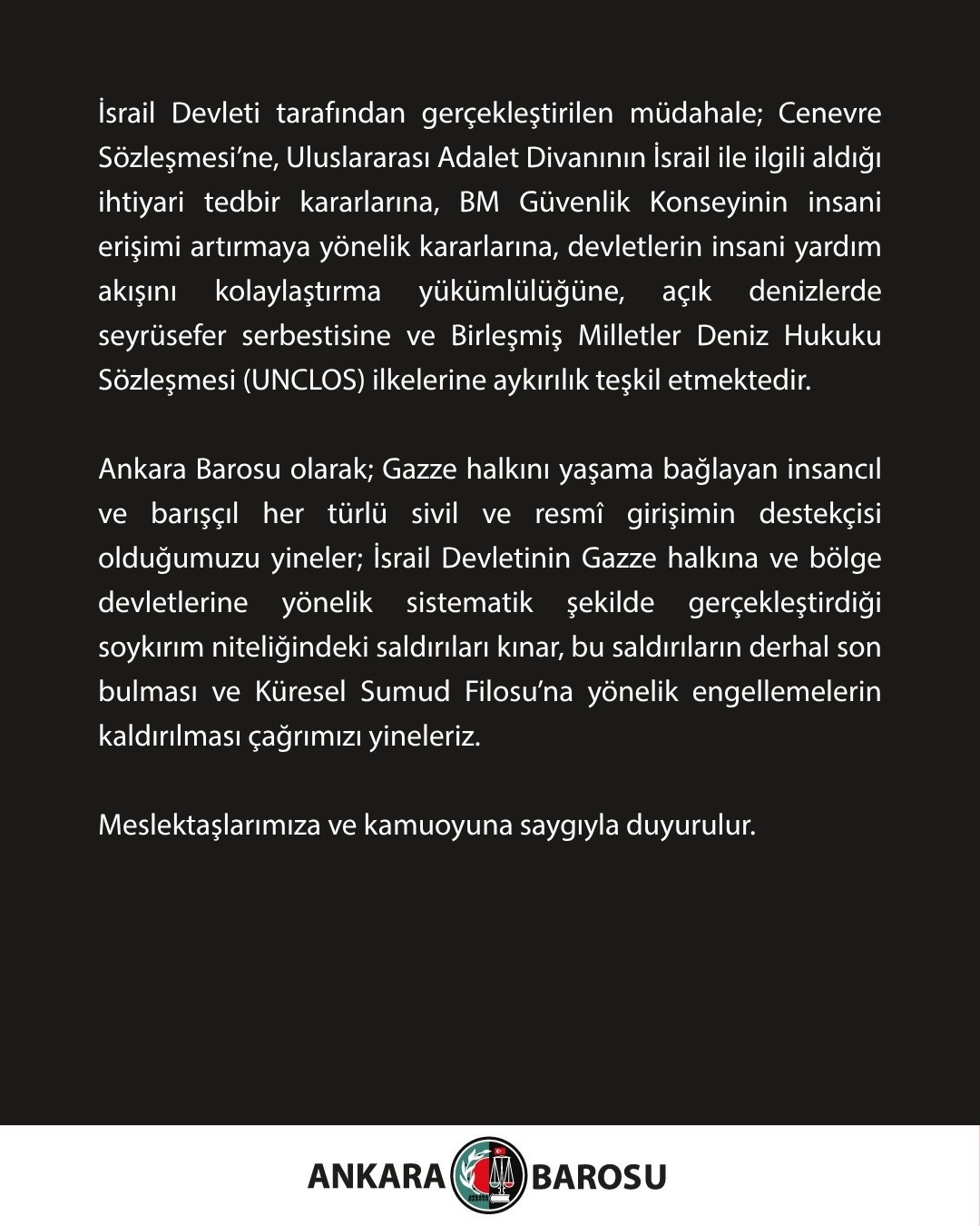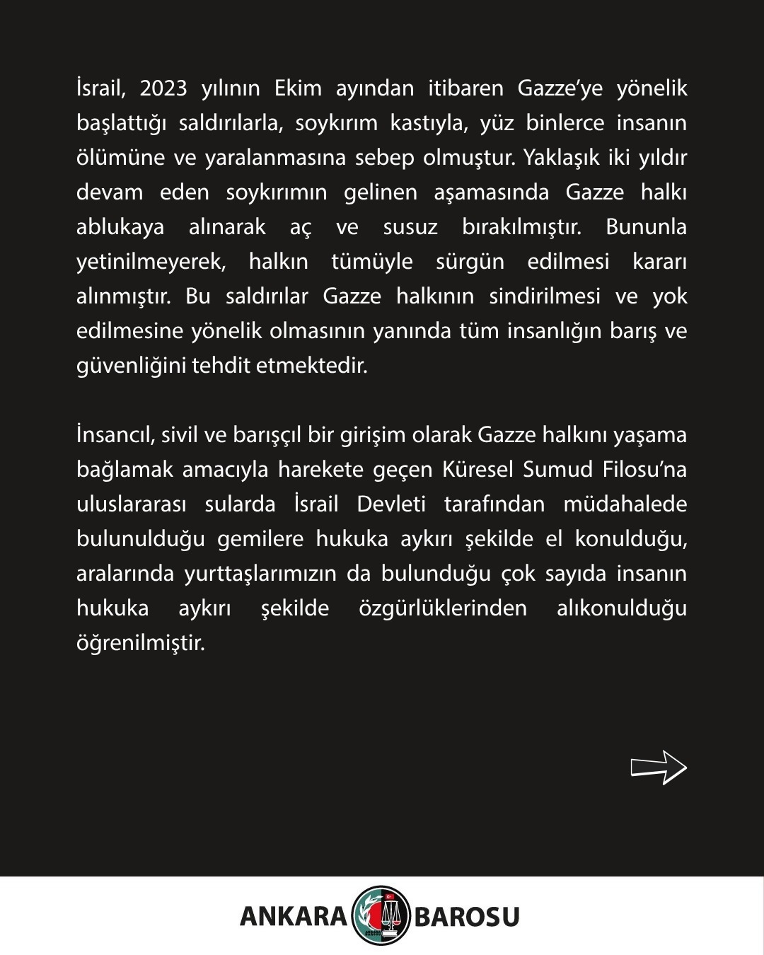 Ankara Barosu olarak; Gazze halkını yaşama bağlayan insancıl ve barışçıl her türlü sivil ve resmî girişimin destekçisi olduğumuzu yineler; İsrail Devletinin Gazze halkına ve bölge devletlerine yönelik sistematik şekilde gerçekleştirdiği soykırım niteliğindeki saldırıları kınar, bu saldırıların derhal son bulması ve Küresel Sumud Filosu’na yönelik engellemelerin kaldırılması çağrımızı yineleriz.
