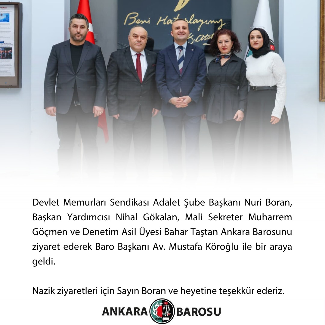 DEVLET MEMURLARI SENDİKASI ADALET ŞUBE BAŞKANI NURİ BORAN, BAŞKAN YARDIMCISI NİHAL GÖKALAN, MALİ SEKRETER MUHARREM GÖÇMEN VE DENETİM ASİL ÜYESİ BAHAR TAŞTAN ANKARA BAROSUNU ZİYARET EDEREK BARO BAŞKANI AV. MUSTAFA KÖROĞLU İLE BİR ARAYA GELDİ.