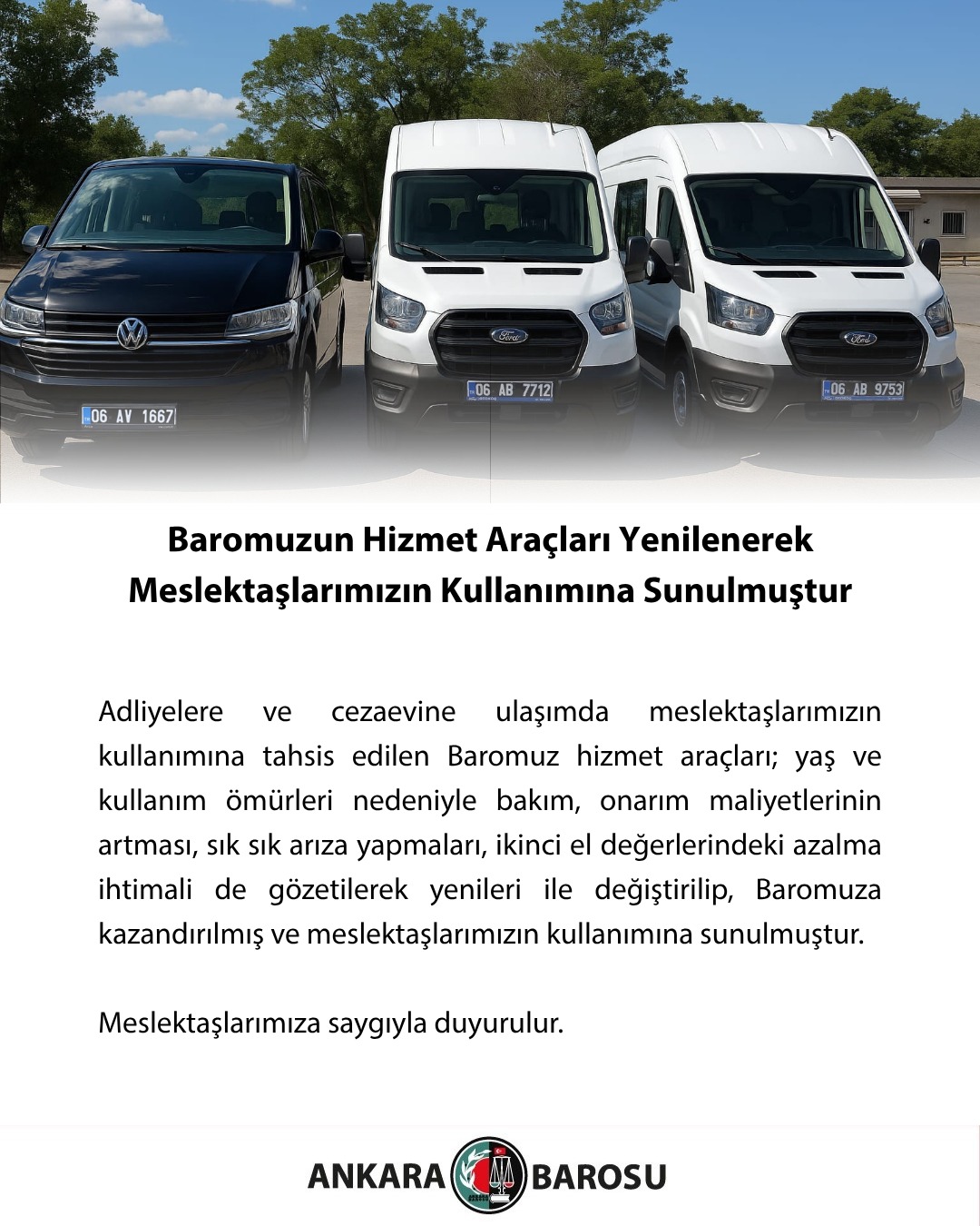 Adliyelere ve cezaevine ulaşımda meslektaşlarımızın kullanımına tahsis edilen Baromuz hizmet araçları; yaş ve kullanım ömürleri nedeniyle bakım, onarım maliyetlerinin artması, sık sık arıza yapmaları, ikinci el değerlerindeki azalma ihtimali de gözetilerek yenileri ile değiştirilip, Baromuza kazandırılmış ve meslektaşlarımızın kullanımına sunulmuştur. Meslektaşlarımıza saygıyla duyurulur.
