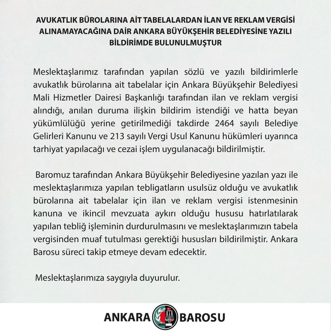 Meslektaşlarımız tarafından yapılan sözlü ve yazılı bildirimlerle avukatlık bürolarına ait tabelalar için Ankara Büyükşehir Belediyesi Mali Hizmetler Dairesi Başkanlığı tarafından ilan ve reklam vergisi alındığı, anılan duruma ilişkin bildirim istendiği ve hatta beyan yükümlülüğü yerine getirilmediği takdirde 2464 sayılı Belediye Gelirleri Kanunu ve 213 sayılı Vergi Usul Kanunu hükümleri uyarınca tarhiyat yapılacağı ve cezai işlem uygulanacağı bildirilmiştir.