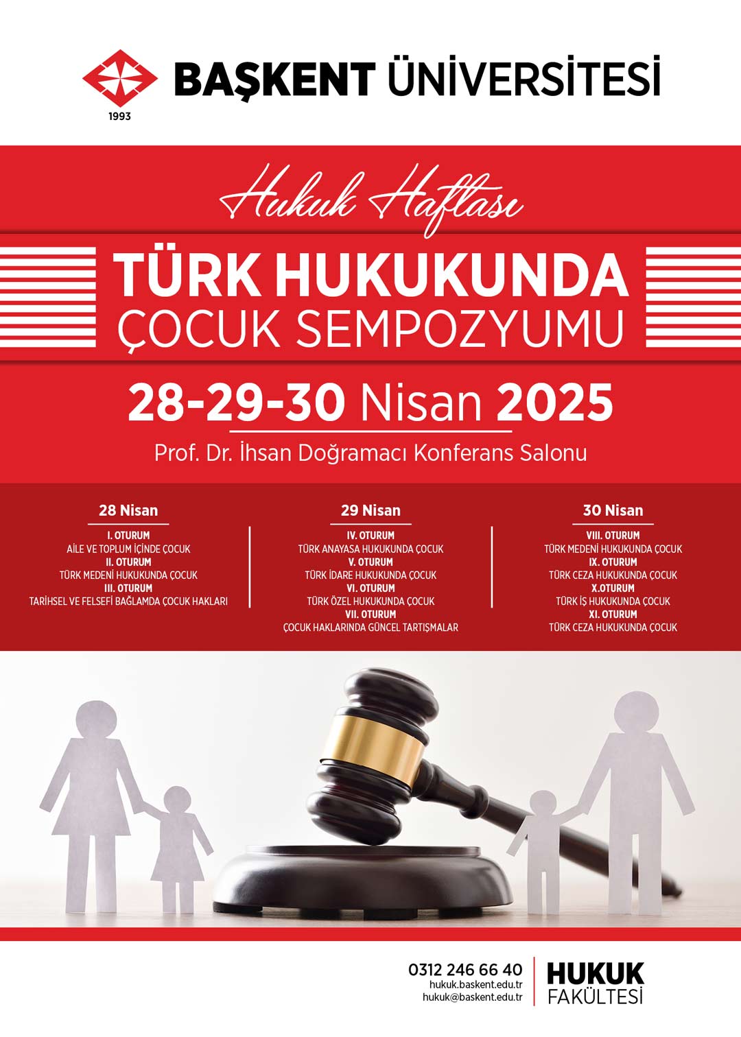 Başkent Üniversitesi Hukuk Fakültesi tarafından 28 - 29 - 30 Nisan 2025 tarihlerinde " Türk Hukukunda Çocuk Sempozyumu " düzenlenecektir. Sempozyum programına buradan ulaşabilirsiniz.