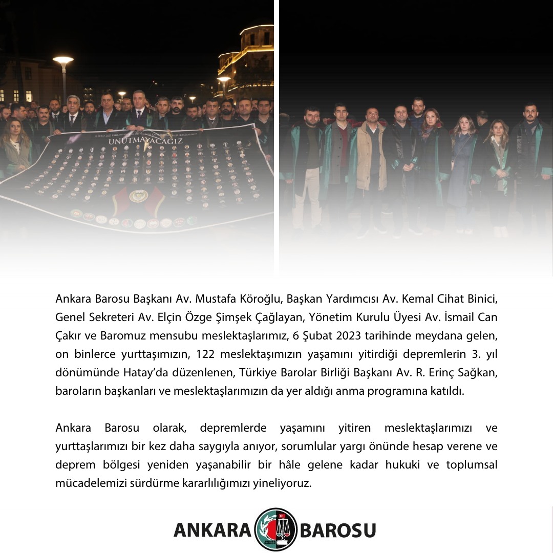 Ankara Barosu olarak, depremlerde yaşamını yitiren meslektaşlarımızı ve yurttaşlarımızı bir kez daha saygıyla anıyor, sorumlular yargı önünde hesap verene ve deprem bölgesi yeniden yaşanabilir bir hâle gelene kadar hukuki ve toplumsal mücadelemizi sürdürme kararlılığımızı yineliyoruz.