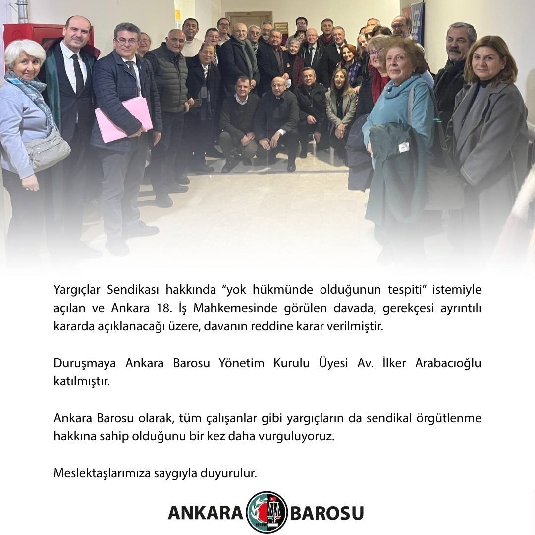 Ankara Barosu olarak, tüm çalışanlar gibi yargıçların da sendikal örgütlenme hakkına sahip olduğunu bir kez daha vurguluyoruz.