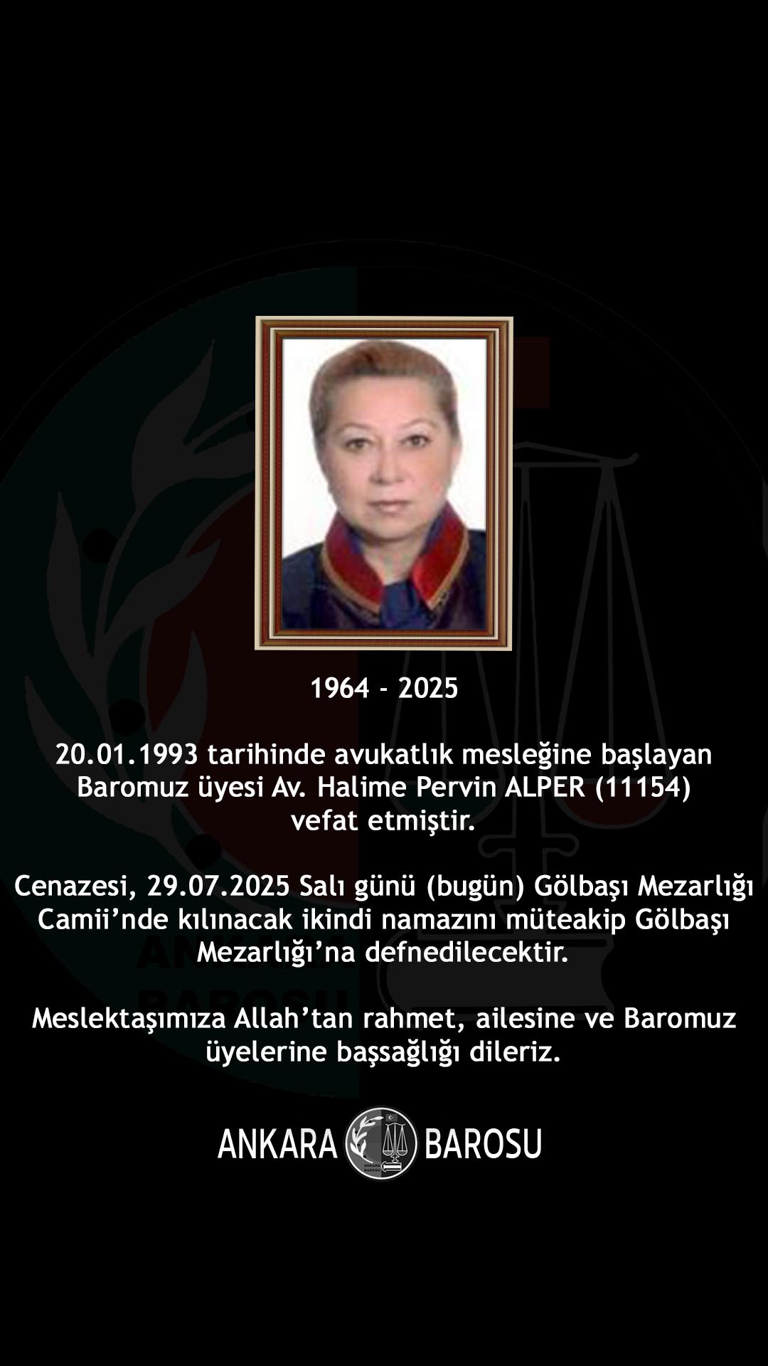 20.01.1993 tarihinde avukatlık mesleğine başlayan Baromuz üyesi Av. Halime Pervin ALPER (11154) vefat etmiştir. Cenazesi, 29.07.2025 Salı günü (bugün) Gölbaşı Mezarlığı Camii’nde kılınacak ikindi namazını müteakip Gölbaşı Mezarlığı’na defnedilecektir. Meslektaşımıza Allah'tan rahmet, ailesine ve Baromuz üyelerine başsağlığı dileriz.