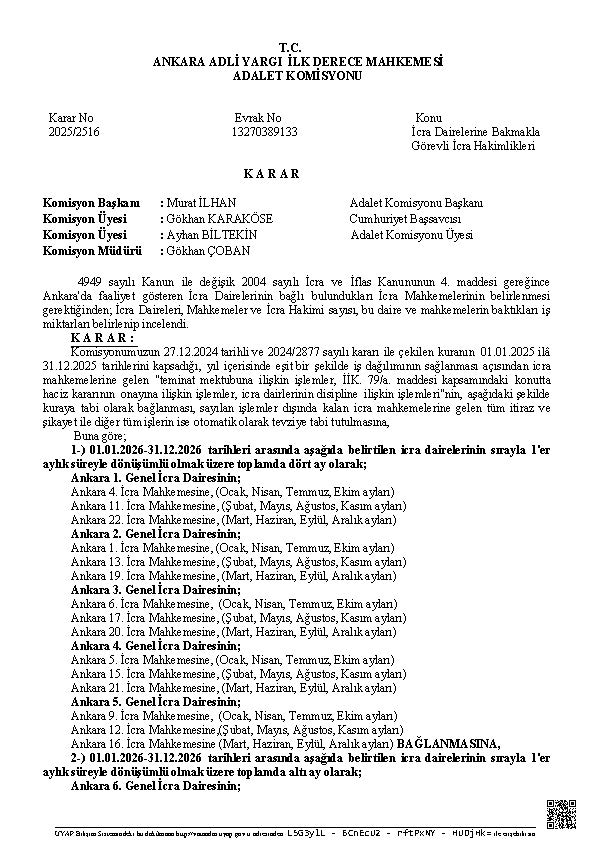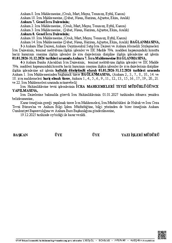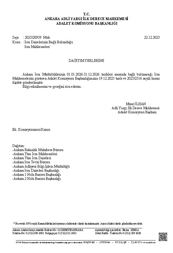 Ankara İcra Müdürlüklerinin 01.01.2026-31.12.2026 tarihleri arasında bağlı bulunacağı İcra Mahkemelerini gösteren Adalet Komisyonu Başkanlığımızın 19.12.2025 tarih ve 2025/2516 sayılı kararı ilişikte gönderilmiştir.