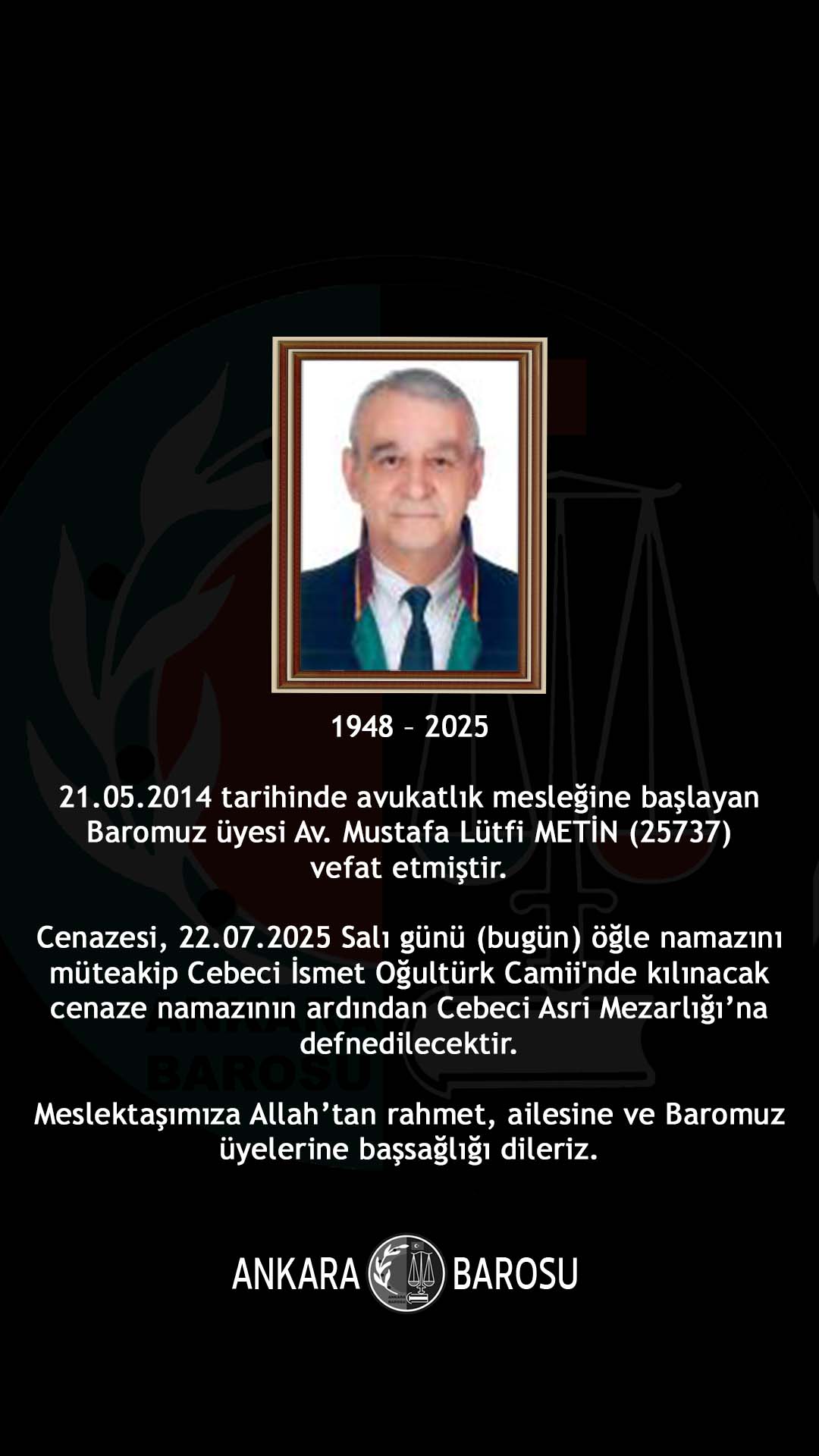 BAROMUZ ÜYESİ AV. MUSTAFA LÜTFİ METİN (25737) VEFAT ETMİŞTİR