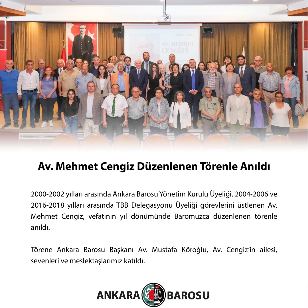 2000-2002 yılları arasında Ankara Barosu Yönetim Kurulu Üyeliği, 2004-2006 ve 2016-2018 yılları arasında TBB Delegasyonu Üyeliği görevlerini üstlenen Av. Mehmet Cengiz, vefatının yıl dönümünde Baromuzca düzenlenen törenle anıldı.