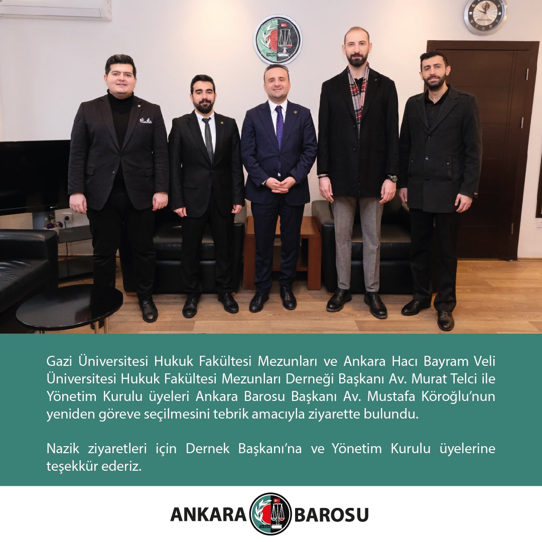 GAZİ ÜNİVERSİTESİ HUKUK FAKÜLTESİ MEZUNLARI VE ANKARA HACI BAYRAM VELİ ÜNİVERSİTESİ HUKUK FAKÜLTESİ MEZUNLARI DERNEĞİ BAŞKANI AV. MURAT TELCİ İLE YÖNETİM KURULU ÜYELERİ ANKARA BAROSU BAŞKANI AV. MUSTAFA KÖROĞLU’NUN YENİDEN GÖREVE SEÇİLMESİNİ TEBRİK AMACIYLA ZİYARETTE BULUNDU