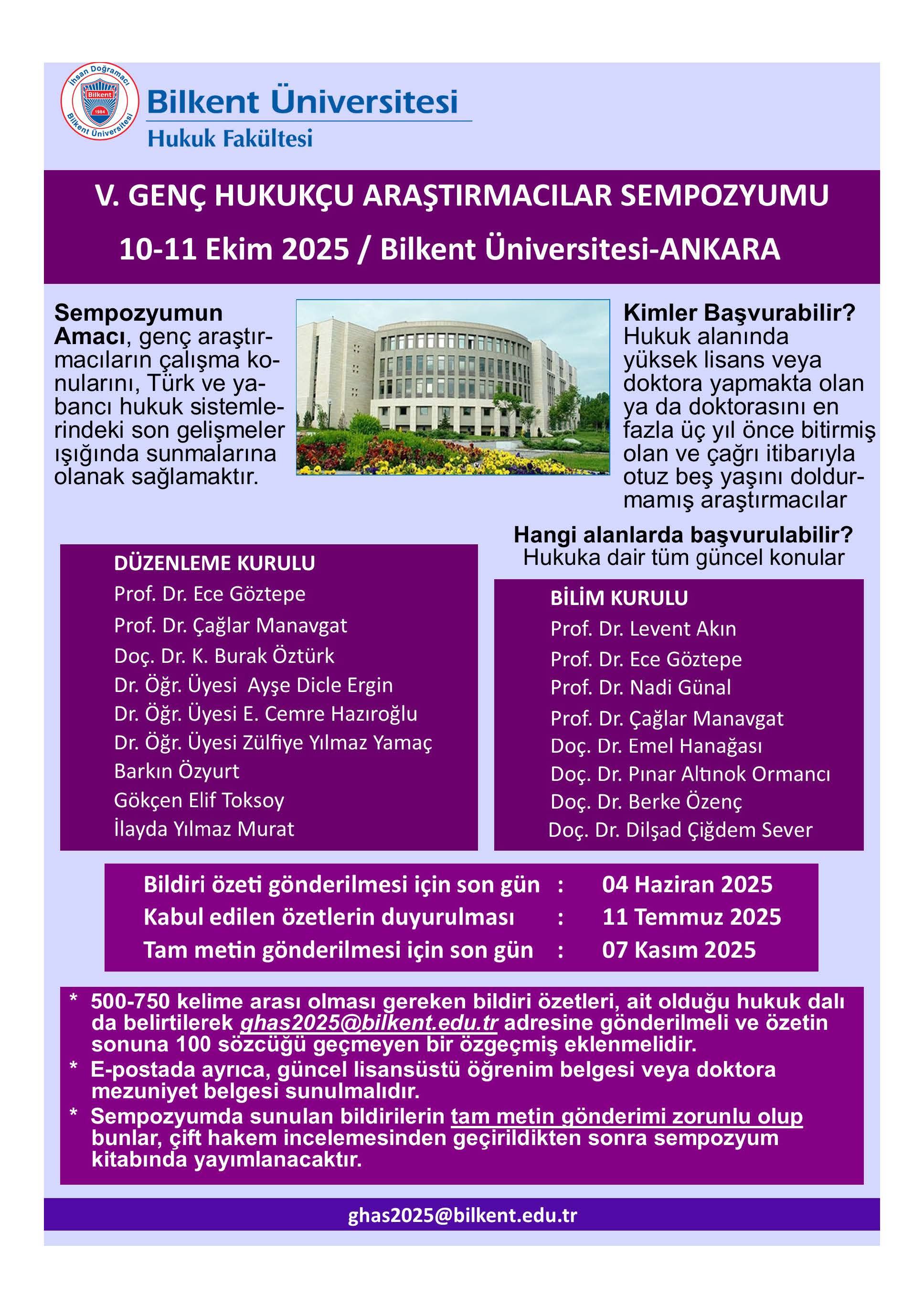 BİLKENT ÜNİVERSİTESİ 20.05.2025 TARİH, 74911 SAYI VE V. GENÇ HUKUKÇU ARAŞTIRMACILAR SEMPOZYUMU KONULU DUYURUSU
