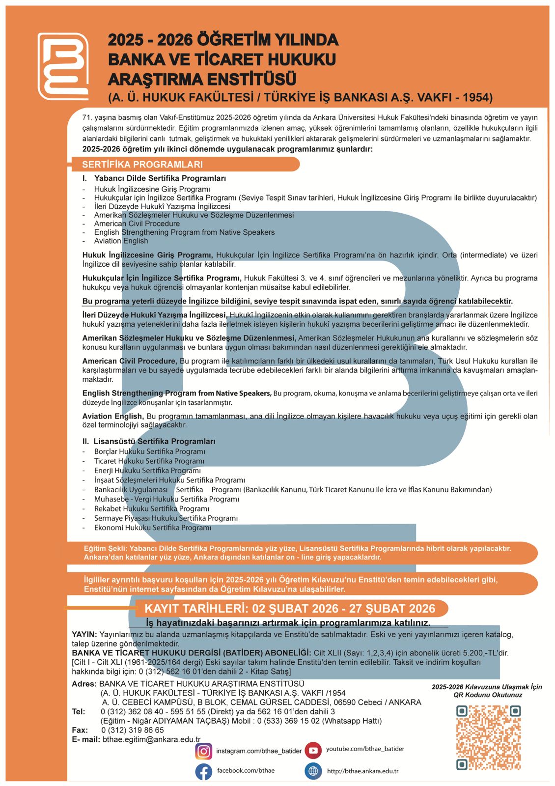 ANKARA ÜNİVERSİTESİ HUKUK FAKÜLTESİ BANKA VE TİCARET HUKUKU ARAŞTIRMA ENSTİTÜSÜ 2025-2026 ÖĞRETİM YILI İKİNCİ DÖNEMDE UYGULANACAK EĞİTİM PROGRAMLARI