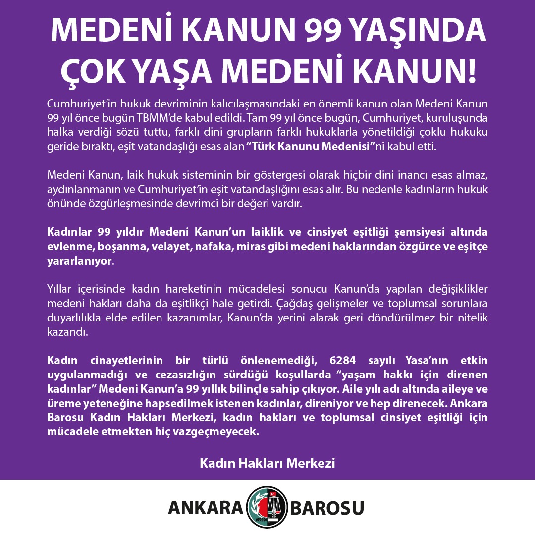 Kadın cinayetlerinin bir türlü önlenemediği, 6284 sayılı Yasa'nın etkin uygulanmadığı ve cezasızlığın sürdüğü koşullarda "yaşam hakkı için direnen kadınlar" Medeni Kanun'a 99 yıllık bilinçle sahip çıkıyor. Aile yılı adı altında aileye ve üreme yeteneğine hapsedilmek istenen kadınlar, direniyor ve hep direnecek. Ankara Barosu Kadın Hakları Merkezi, kadın hakları ve toplumsal cinsiyet eşitliği için mücadele etmekten hiç vazgeçmeyecek.