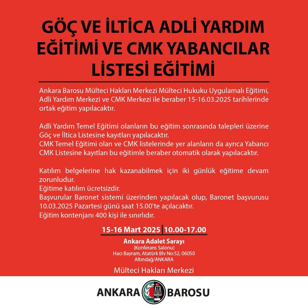 ANKARA BAROSU MÜLTECİ HAKLARI MERKEZİ GÖÇ VE İLTİCA ADLİ YARDIM EĞİTİMİ VE CMK YABANCILAR LİSTESİ EĞİTİMİ 15-16.03.2025 TARİHLERİNDE YAPILACAKTIR