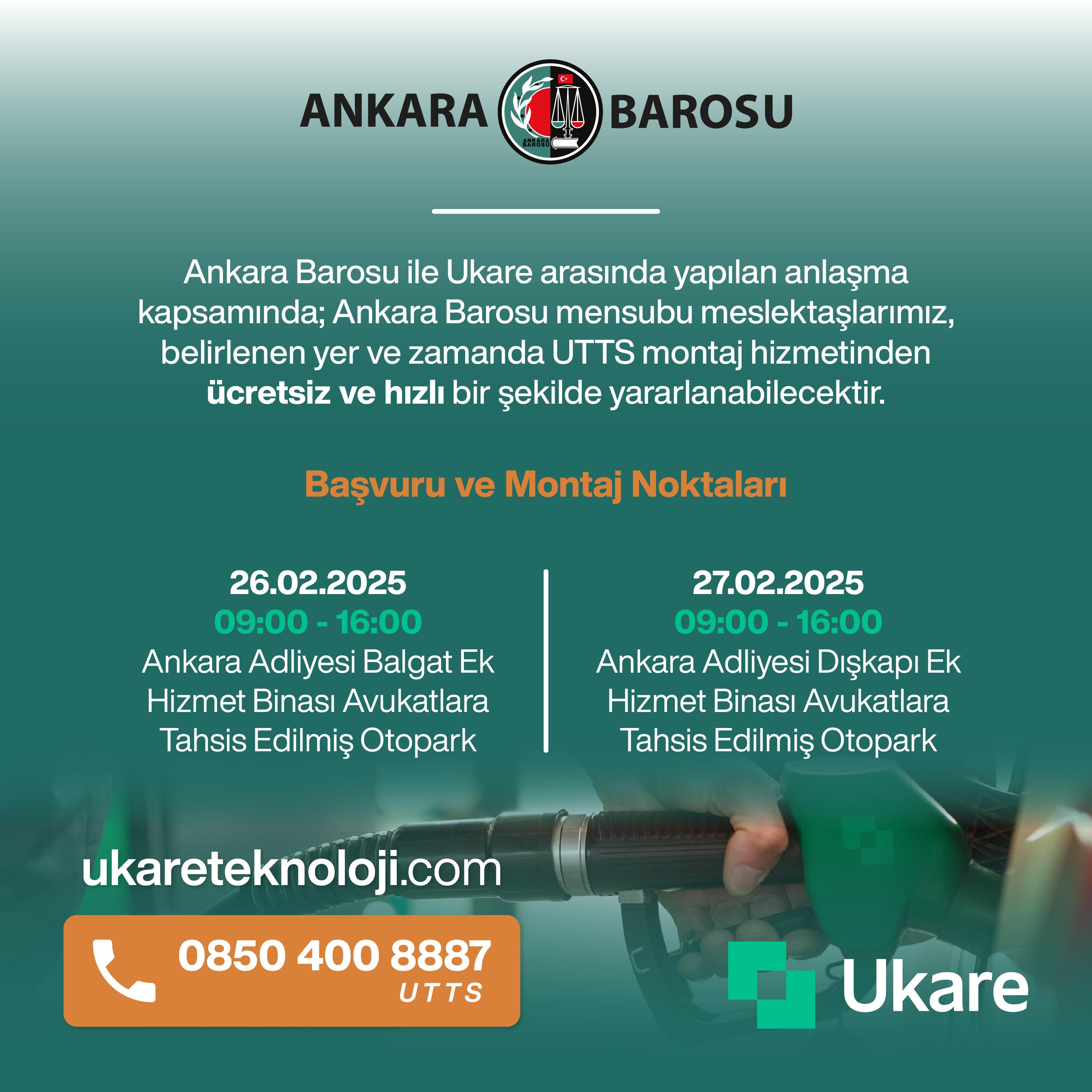ANKARA BAROSU İLE UKARE ARASINDA YAPILAN ANLAŞMA KAPSAMINDA; ANKARA BAROSU MENSUBU MESLEKTAŞLARIMIZ, BELİRLENEN YER VE ZAMANDA UTTS MONTAJ HİZMETİNDEN ÜCRETSİZ VE HIZLI BİR ŞEKİLDE YARARLANABİLECEKTİR