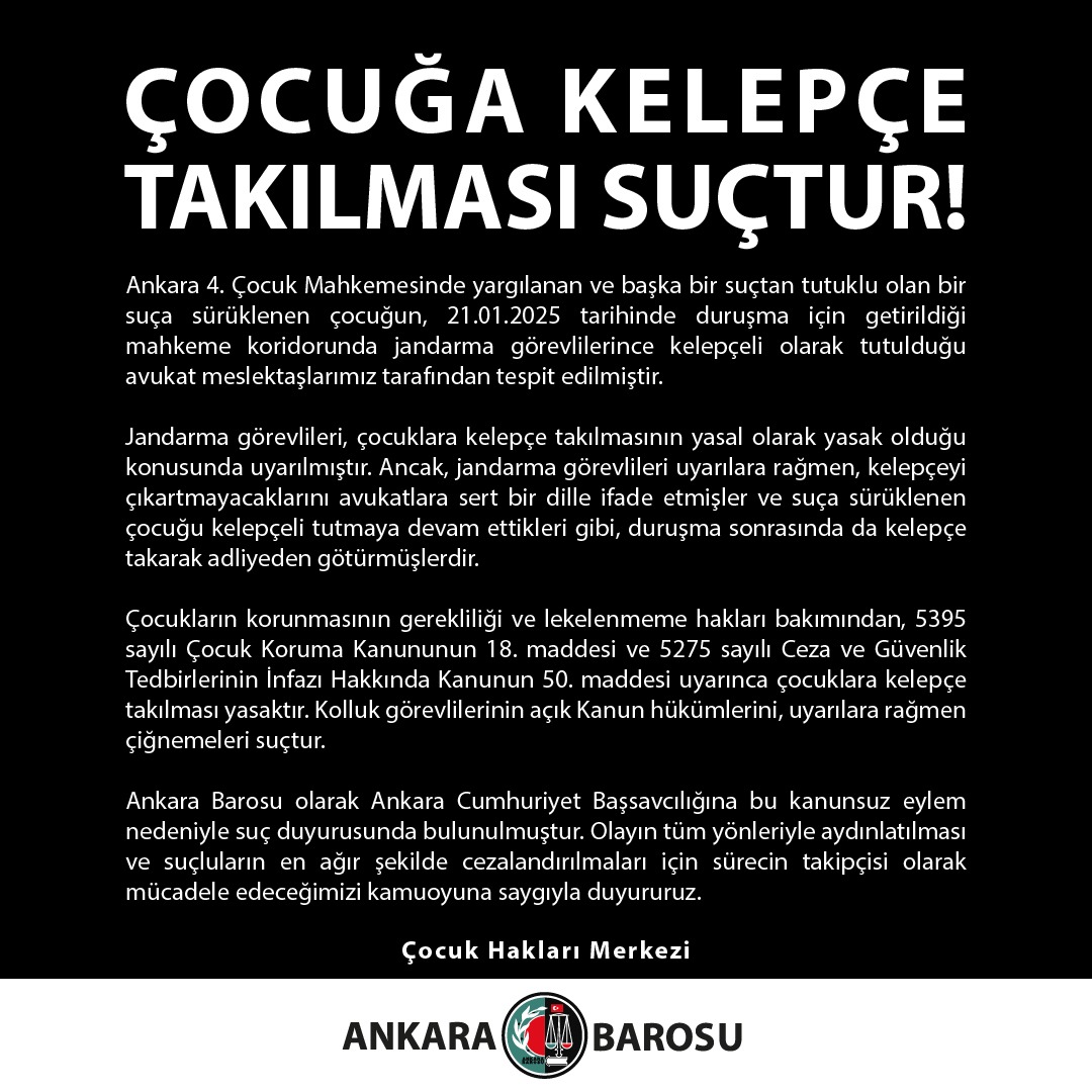 Ankara 4. Çocuk Mahkemesinde yargılanan ve başka bir suçtan tutuklu olan bir suça sürüklenen çocuğun, 21.01.2025 tarihinde duruşma için getirildiği mahkeme koridorunda jandarma görevlilerince kelepçeli olarak tutulduğu avukat meslektaşlarımız tarafından tespit edilmiştir.