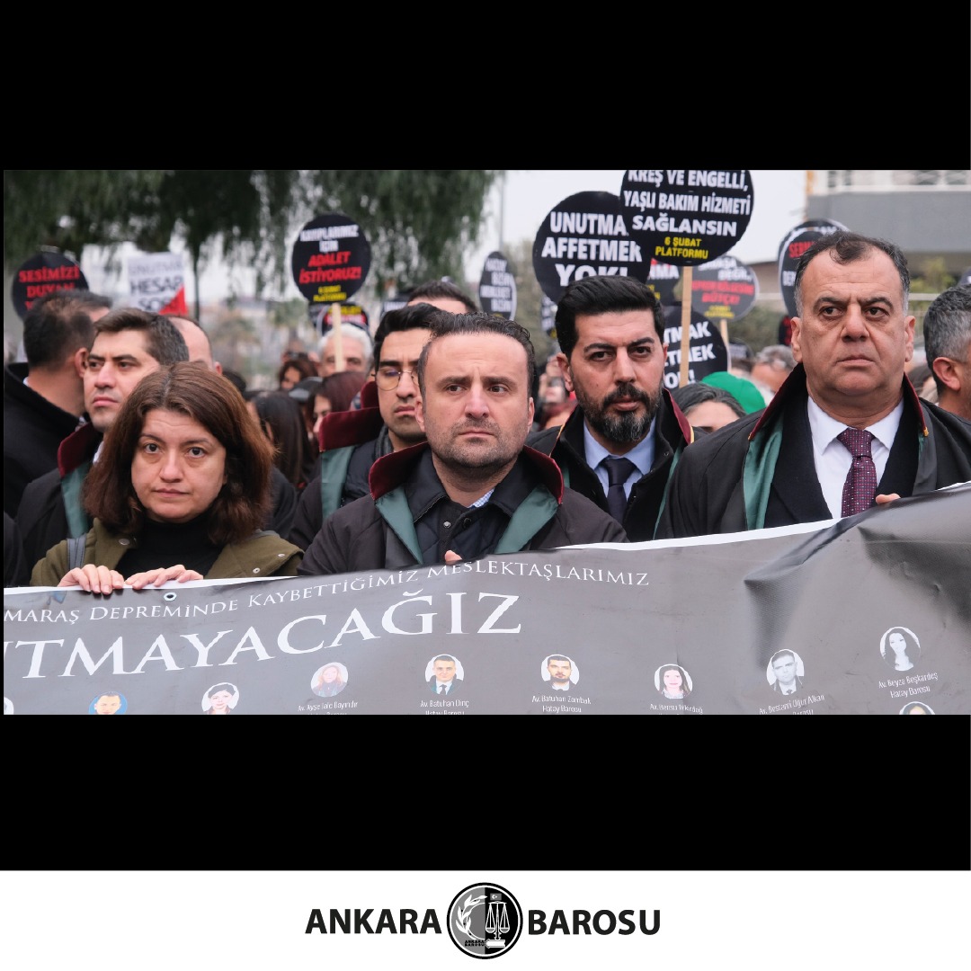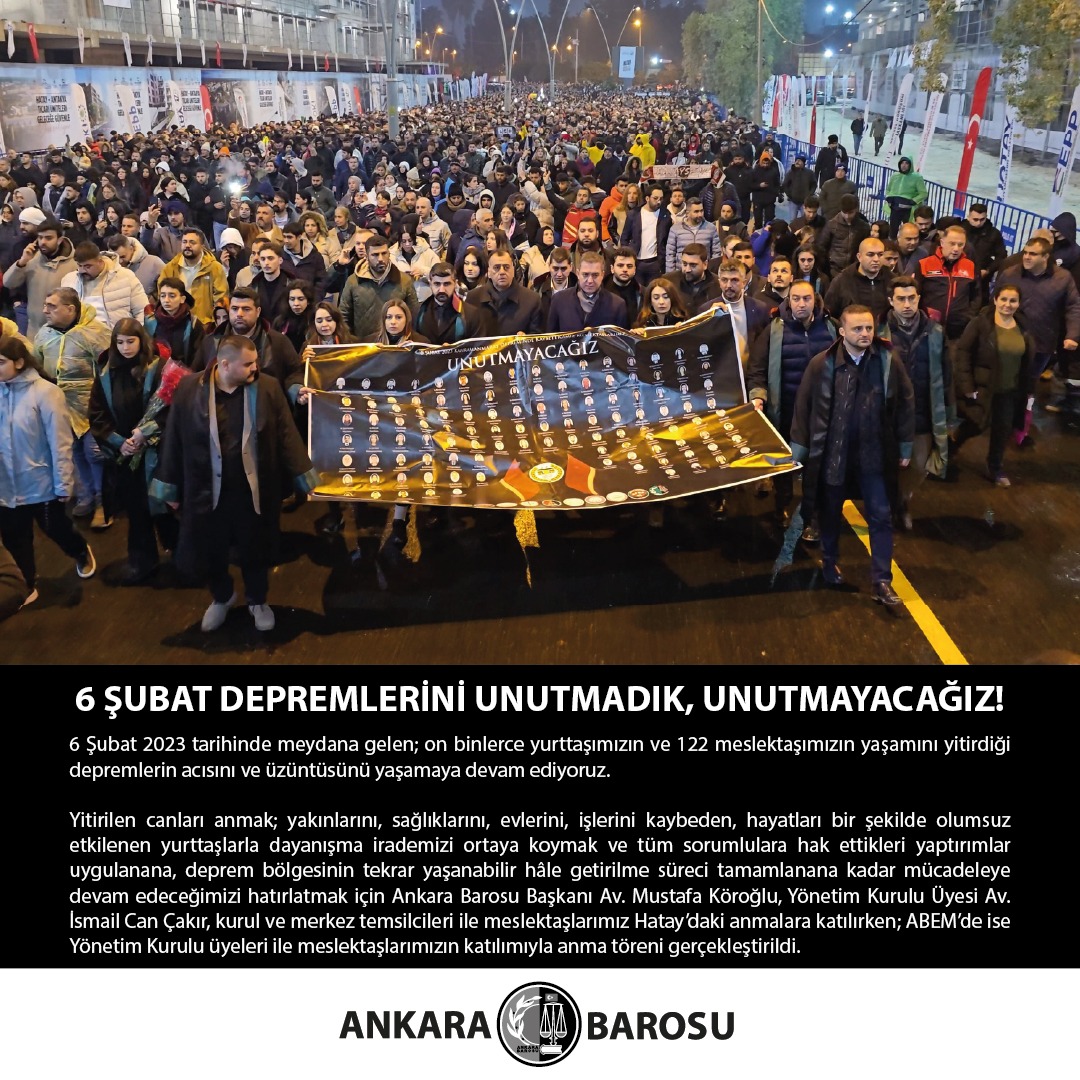 Yitirilen canları anmak; yakınlarını, sağlıklarını, evlerini, işlerini kaybeden, hayatları bir şekilde olumsuz etkilenen yurttaşlarla dayanışma irademizi ortaya koymak ve tüm sorumlulara hak ettikleri yaptırımlar uygulanana, deprem bölgesinin tekrar yaşanabilir hâle getirilme süreci tamamlanana kadar mücadeleye devam edeceğimizi hatırlatmak için Ankara Barosu Başkanı Av. Mustafa Köroğlu, Yönetim Kurulu Üyesi Av. İsmail Can Çakır, kurul ve merkez temsilcileri ile meslektaşlarımız Hatay’daki anmalara katılırken; ABEM’de ise Yönetim Kurulu üyeleri ile meslektaşlarımızın katılımıyla anma töreni gerçekleştirildi.
