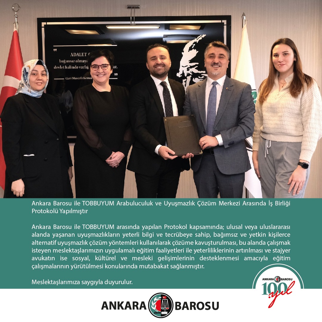 Ankara Barosu ile TOBBUYUM arasında yapılan Protokol kapsamında; ulusal veya uluslararası alanda yaşanan uyuşmazlıkların yeterli bilgi ve tecrübeye sahip, bağımsız ve yetkin kişilerce alternatif uyuşmazlık çözüm yöntemleri kullanılarak çözüme kavuşturulması, bu alanda çalışmak isteyen meslektaşlarımızın uygulamalı eğitim faaliyetleri ile yeterliliklerinin artırılması ve stajyer avukatın ise sosyal, kültürel ve mesleki gelişimlerinin desteklenmesi amacıyla eğitim çalışmalarının yürütülmesi konularında mutabakat sağlanmıştır.