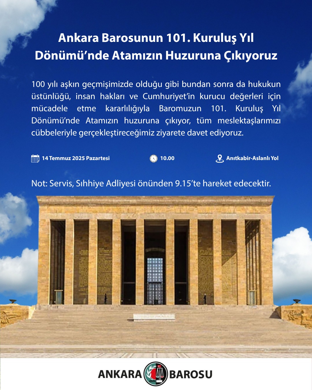 100 yılı aşkın geçmişimizde olduğu gibi bundan sonra da hukukun üstünlüğü, insan hakları ve Cumhuriyet’in kurucu değerleri için mücadele etme kararlılığıyla Baromuzun 101. Kuruluş Yıl Dönümü’nde Atamızın huzuruna çıkıyor, tüm meslektaşlarımızı cübbeleriyle gerçekleştireceğimiz ziyarete davet ediyoruz.