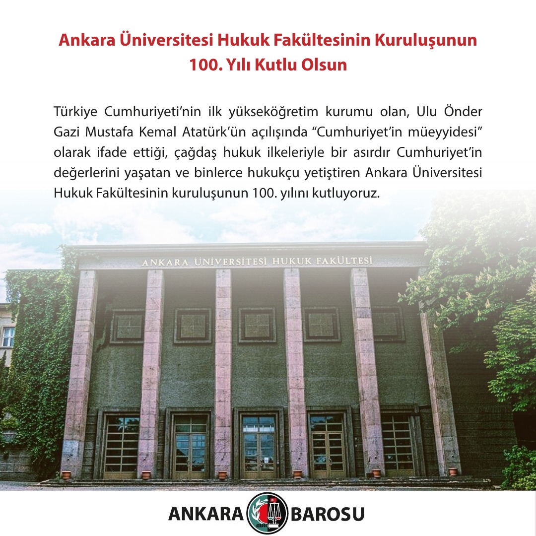 Türkiye Cumhuriyeti’nin ilk yükseköğretim kurumu olan, Ulu Önder Gazi Mustafa Kemal Atatürk’ün açılışında “Cumhuriyet’in müeyyidesi” olarak ifade ettiği, çağdaş hukuk ilkeleriyle bir asırdır Cumhuriyet’in değerlerini yaşatan ve binlerce hukukçu yetiştiren Ankara Üniversitesi Hukuk Fakültesinin kuruluşunun 100. yılını kutluyoruz.