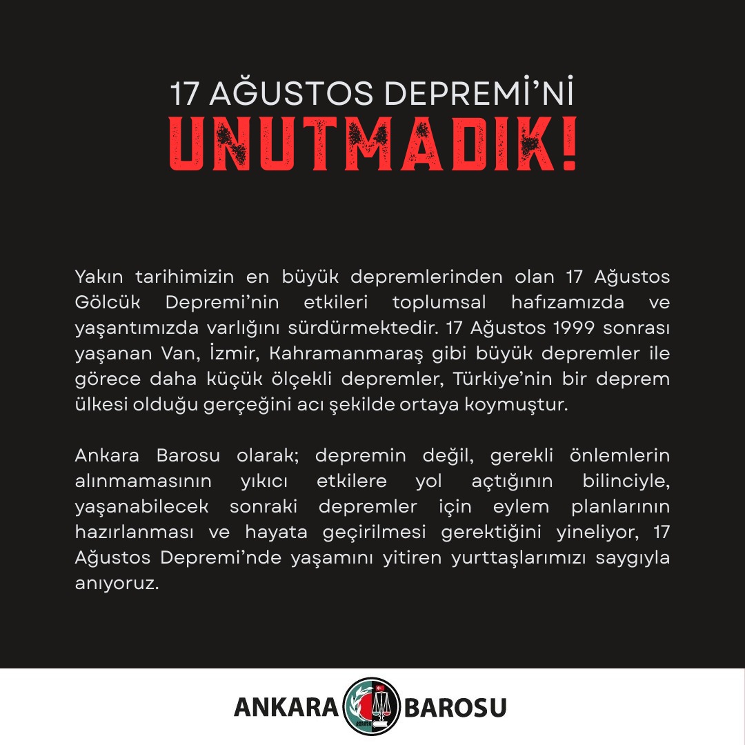 Ankara Barosu olarak; depremin değil, gerekli önlemlerin alınmamasının yıkıcı etkilere yol açtığının bilinciyle, yaşanabilecek sonraki depremler için eylem planlarının hazırlanması ve hayata geçirilmesi gerektiğini yineliyor, 17 Ağustos Depremi’nde yaşamını yitiren yurttaşlarımızı saygıyla anıyoruz.