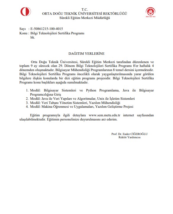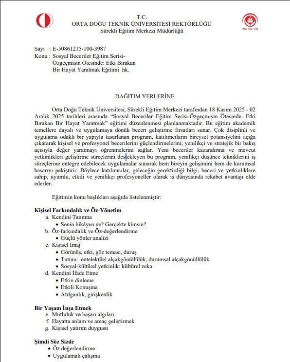 ORTA DOĞU TEKNİK ÜNİVERSİTESİ REKTÖRLÜĞÜ'NÜN “SOSYAL BECERİLER EĞİTİM SERİSİ-ÖZGEÇMİŞİN ÖTESİNDE: ETKİ BIRAKAN BİR HAYAT YARATMAK” EĞİTİMİ VE BİLGİ TEKNOLOJİLERİ SERTİFİKA PROGRAMI HAKKINDAKİ DUYURULARI