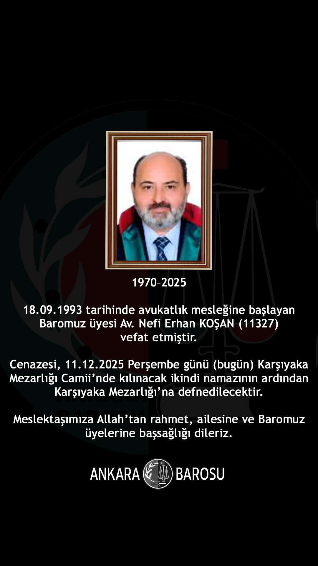 BAROMUZ ÜYESİ AV. NEFİ ERHAN KOŞAN (11327) VEFAT ETMİŞTİR.