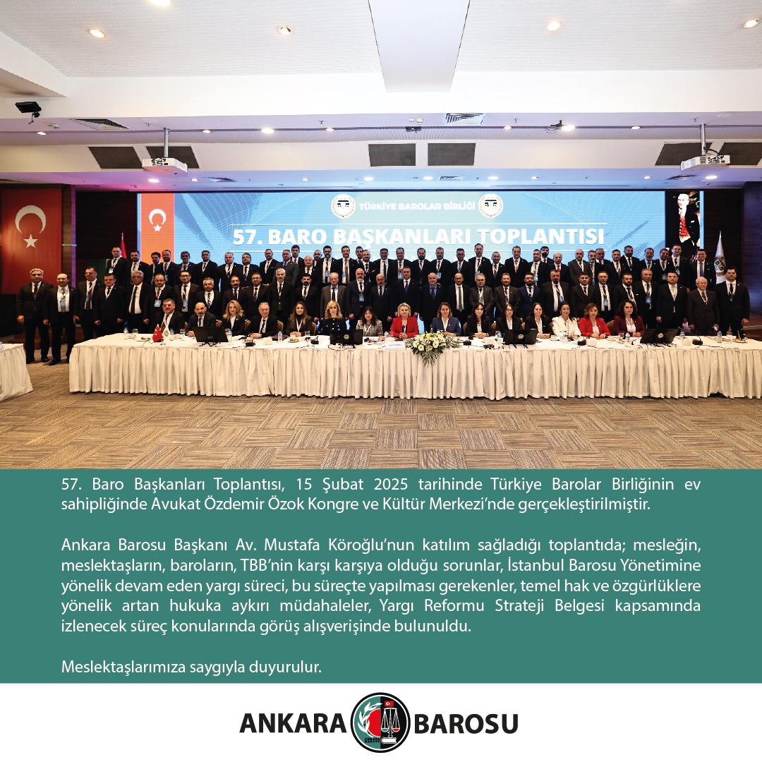 57. BARO BAŞKANLARI TOPLANTISI, 15 ŞUBAT 2025 TARİHİNDE TÜRKİYE BAROLAR BİRLİĞİNİN EV SAHİPLİĞİNDE AVUKAT ÖZDEMİR ÖZOK KONGRE VE KÜLTÜR MERKEZİ’NDE GERÇEKLEŞTİRİLMİŞTİR.