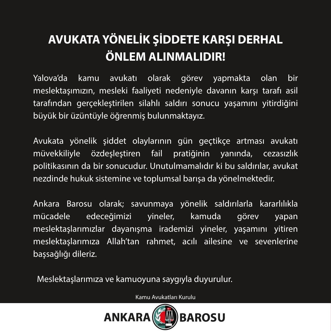 Ankara Barosu olarak; savunmaya yönelik saldırılarla kararlılıkla mücadele edeceğimizi yineler, kamuda görev yapan meslektaşlarımızlar dayanışma irademizi yineler, yaşamını yitiren meslektaşlarımıza Allah’tan rahmet, acılı ailesine ve sevenlerine başsağlığı dileriz.
