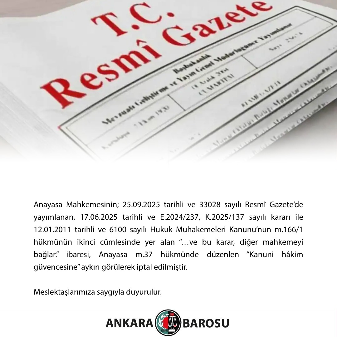 ANAYASA MAHKEMESİNİN; 25.09.2025 TARİHLİ VE 33028 SAYILI RESMÎ GAZETE’DE YAYIMLANAN, 17.06.2025 TARİHLİ VE E.2024/237, K.2025/137 SAYILI KARARI İLE 12.01.2011 TARİHLİ VE 6100 SAYILI HUKUK MUHAKEMELERİ KANUNU’NUN M.166/1 HÜKMÜNÜN İKİNCİ CÜMLESİNDE YER ALAN “…VE BU KARAR, DİĞER MAHKEMEYİ BAĞLAR.” İBARESİ, ANAYASA M.37 HÜKMÜNDE DÜZENLEN “KANUNİ HÂKİM GÜVENCESİNE” AYKIRI GÖRÜLEREK İPTAL EDİLMİŞTİR.