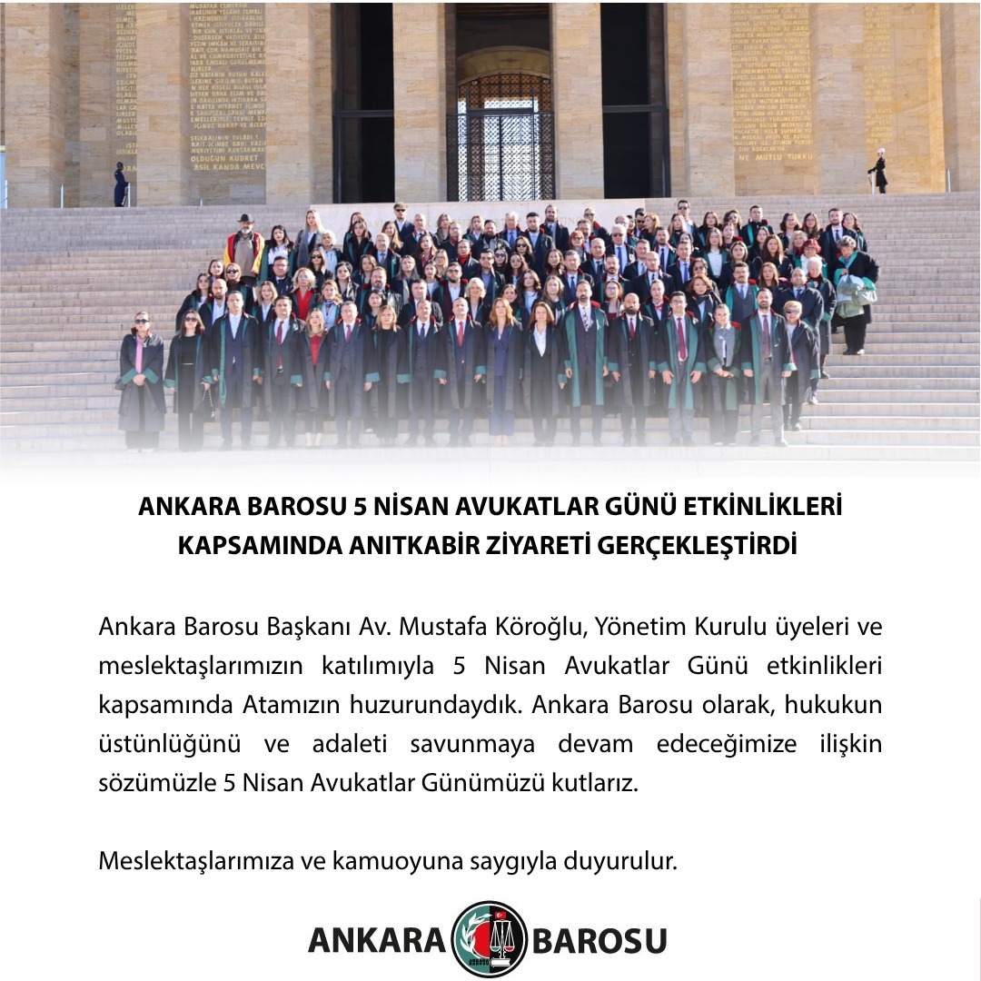 Ankara Barosu Başkanı Av. Mustafa Köroğlu, Yönetim Kurulu üyeleri ve meslektaşlarımızın katılımıyla 5 Nisan Avukatlar Günü etkinlikleri kapsamında Atamızın huzurundaydık. Ankara Barosu olarak, hukukun üstünlüğünü ve adaleti savunmaya devam edeceğimize ilişkin sözümüzle 5 Nisan Avukatlar Günümüzü kutlarız.