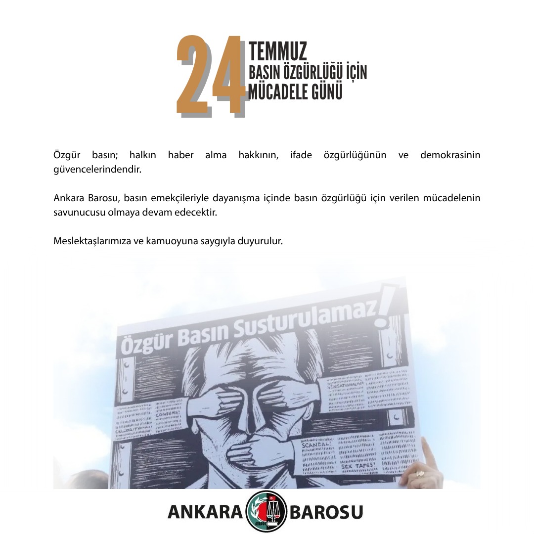 Ankara Barosu, basın emekçileriyle dayanışma içinde basın özgürlüğü için verilen mücadelenin savunucusu olmaya devam edecektir. Meslektaşlarımıza ve kamuoyuna saygıyla duyurulur.