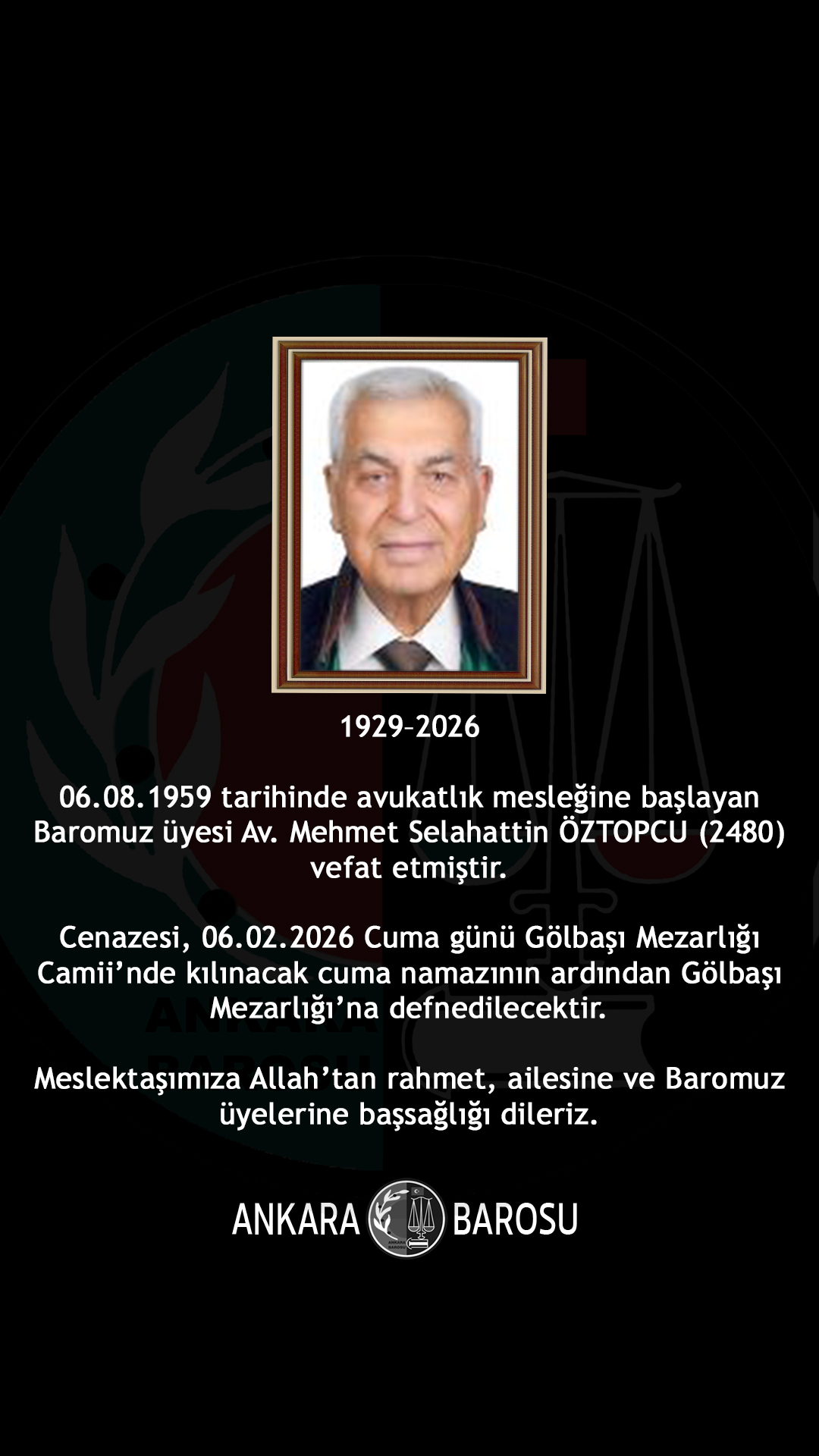 Baromuz üyesi Av. Mehmet Selahattin ÖZTOPCU (2480) vefat etmiştir. Cenazesi, 06.02.2026 Cuma günü Gölbaşı Mezarlığı Camii’nde kılınacak cuma namazının ardından Gölbaşı Mezarlığı’na defnedilecektir. Meslektaşımıza Allah'tan rahmet, ailesine ve Baromuz üyelerine başsağlığı dileriz.