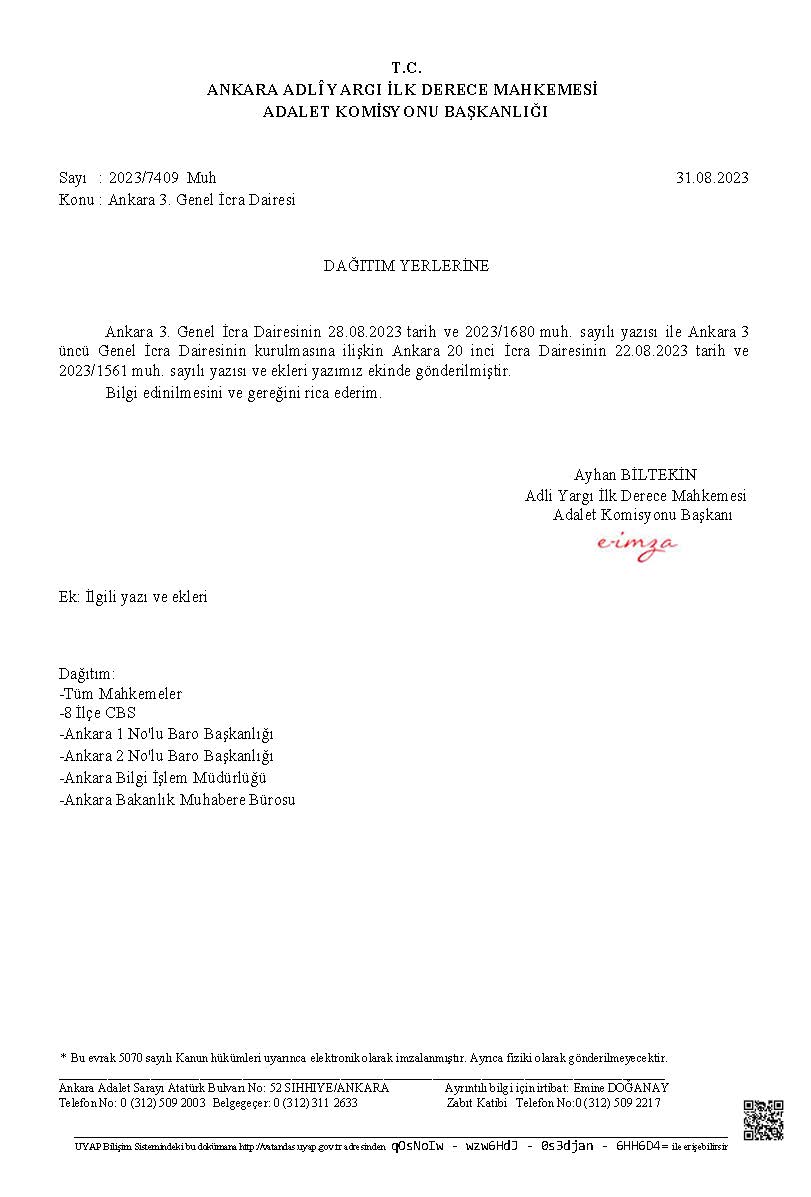 T.C. ANKARA ADLÎ YARGI İLK DERECE MAHKEMESİ ADALET KOMİSYONU BAŞKANLIĞININ 31.08.2023 TARİH, 2023/7409 MUH. SAYILI VE ANKARA 3. GENEL İCRA DAİRESİ KONULU DUYURUSU