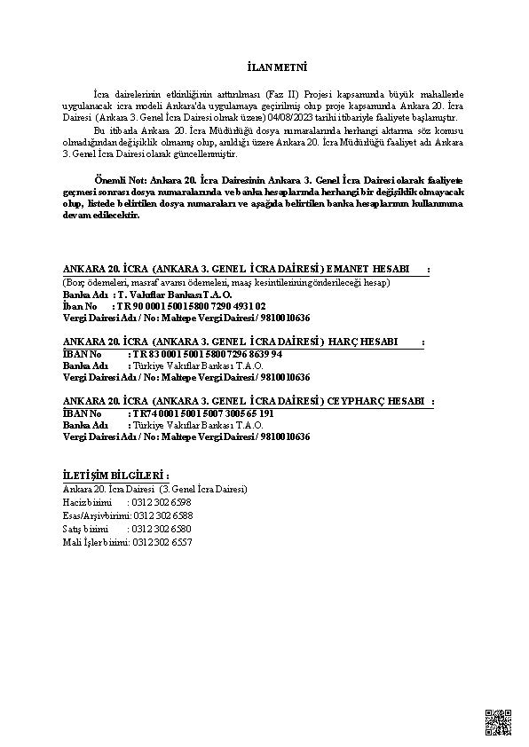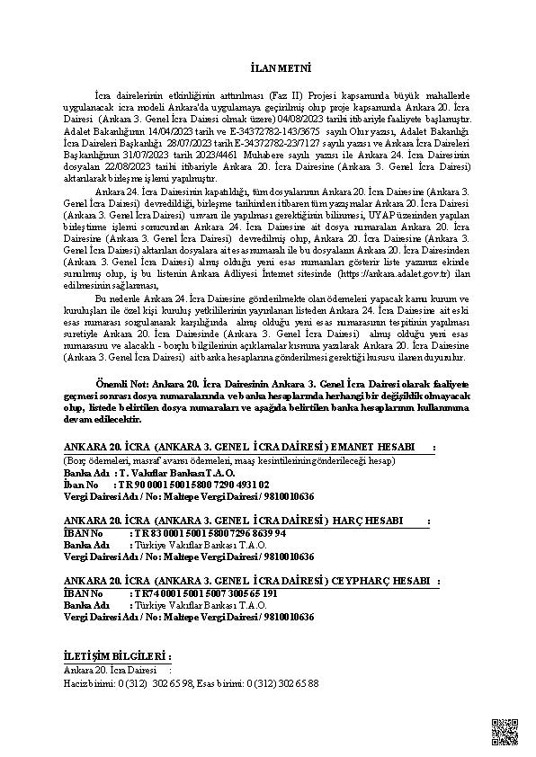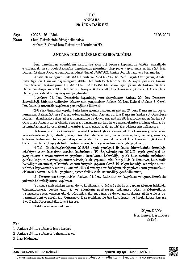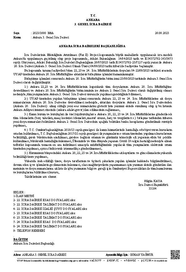 Ankara İcra Daireleri Başkanlığının 28.08.2023 tarihli ve 2023/1680 Muh. sayılı yazısı ile, Ankara 20. İcra Dairesinin isminin “Ankara 3. Genel İcra Dairesi” olarak değiştirildiği bildirilmiştir. Yapılacak yazışmaların Ankara 3. Genel İcra Dairesi ünvanı ile yapılması gerekmektedir. UYAP üzerinden yapılan ünvan değiştirme işlemi sonucunda Ankara 22, 23 ve 24. İcra Müdürlüklerine ait dosya numaralarının Ankara 20. İcra Dairesine devredilmesi nedeniyle aktarılan dosyaların almış olduğu yeni esas numaraları ekte bildirilmiştir.