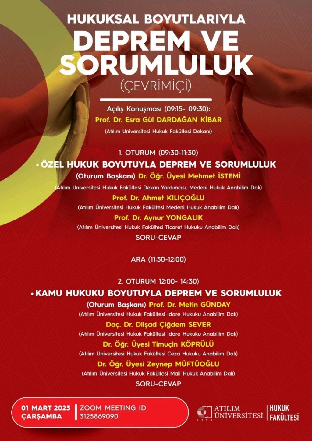 Atılım Üniversitesi Hukuk Fakültesi tarafından düzenlenen "Hukuksal Boyutlarıyla Deprem ve Sorumluluk" konulu çevrimiçi panel 1 Mart 2023 Çarşamba günü Zoom uygulaması üzerinden yapılacaktır.