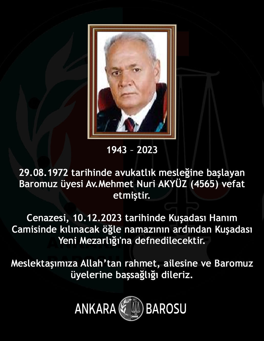 29.08.1972 tarihinde avukatlık mesleğine başlayan Baromuz üyesi Av. Mehmet Nuri AKYÜZ (4565) vefat etmiştir. Cenazesi, 10.12.2023 tarihinde Kuşadası Hanım Camisinde kılınacak öğle namazının ardından Kuşadası Yeni Mezarlığı'na defnedilecektir. Meslektaşımıza Allah’tan rahmet, ailesine ve Baromuz üyelerine başsağlığı dileriz.