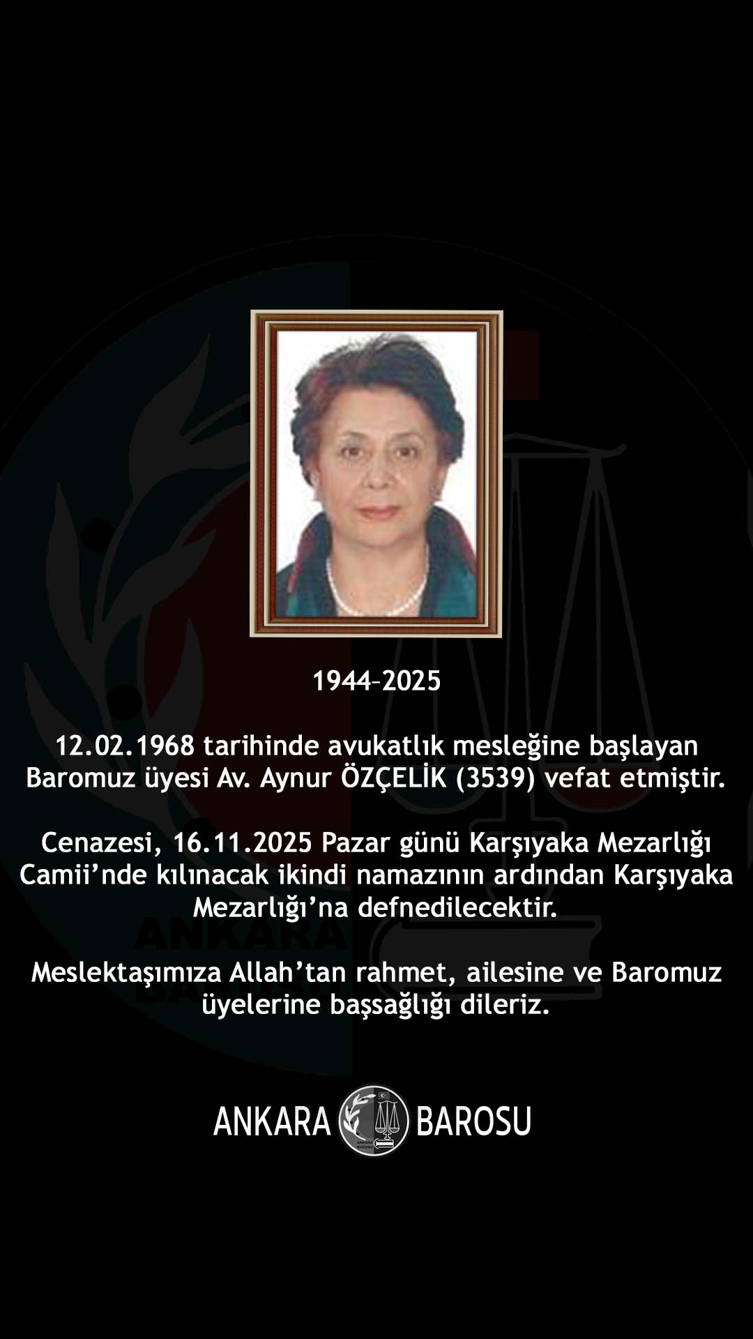BAROMUZ ÜYESİ AV. AYNUR ÖZÇELİK (3539) VEFAT ETMİŞTİR.