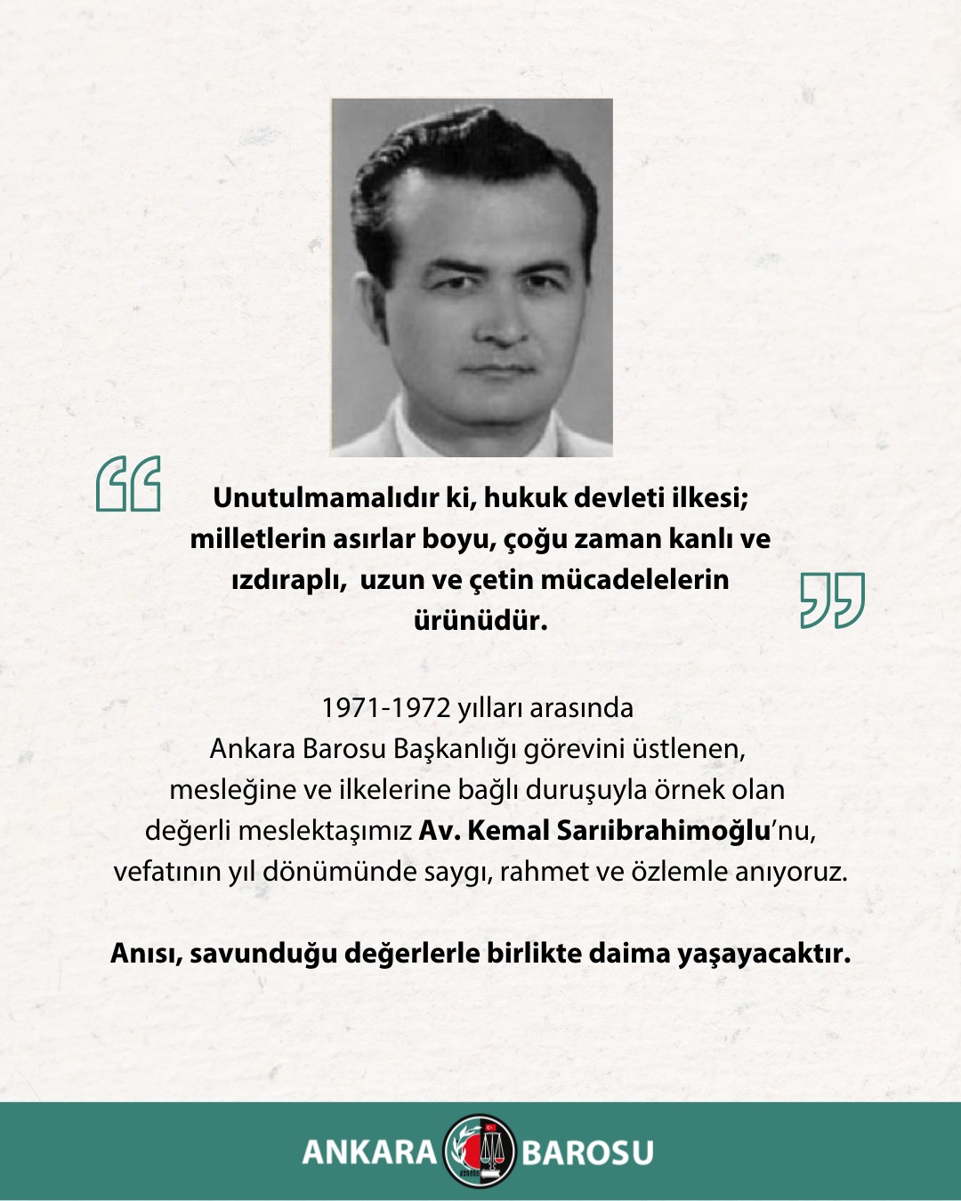 1971-1972 YILLARI ARASINDA ANKARA BAROSU BAŞKANLIĞI GÖREVİNİ ÜSTLENEN, MESLEĞİNE VE İLKELERİNE BAĞLI DURUŞUYLA ÖRNEK OLAN DEĞERLİ MESLEKTAŞIMIZ AV. KEMAL SARIİBRAHİMOĞLU’NU, VEFATININ YIL DÖNÜMÜNDE SAYGI, RAHMET VE ÖZLEMLE ANIYORUZ. ANISI, SAVUNDUĞU DEĞERLERLE BİRLİKTE DAİMA YAŞAYACAKTIR.