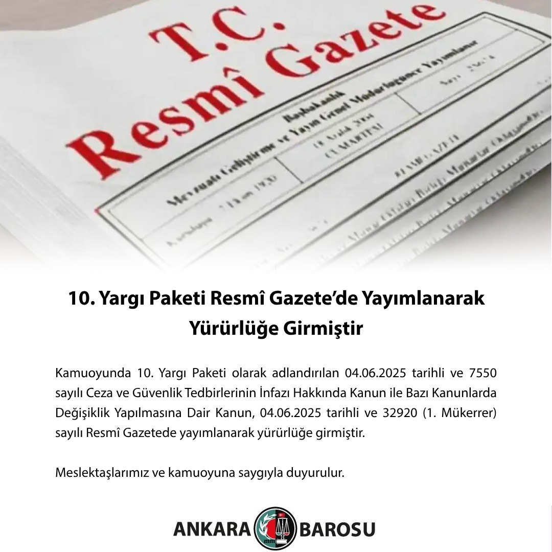 Kamuoyunda 10. Yargı Paketi olarak adlandırılan 04.06.2025 tarihli ve 7550 sayılı Ceza ve Güvenlik Tedbirlerinin İnfazı Hakkında Kanun ile Bazı Kanunlarda Değişiklik Yapılmasına Dair Kanun, 05.06.2025 tarihli ve 32921 sayılı Resmî Gazetede yayımlanarak yürürlüğe girmiştir. Meslektaşlarımız ve kamuoyuna saygıyla duyurulur.
